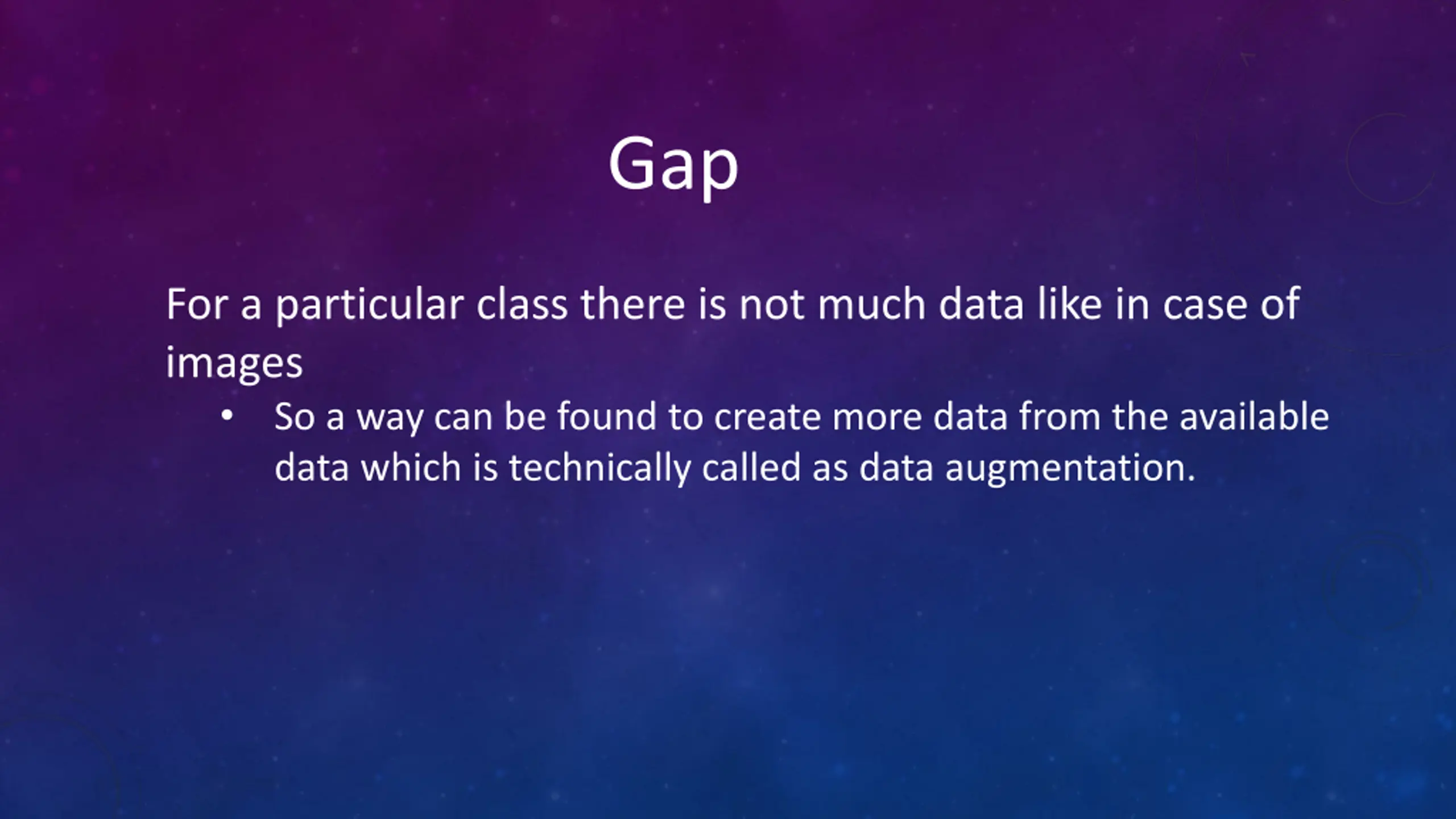 Gap For a particular class there is not much data like in case of images So a way can be found to create more data from the available data which is technically called as data augmentation.