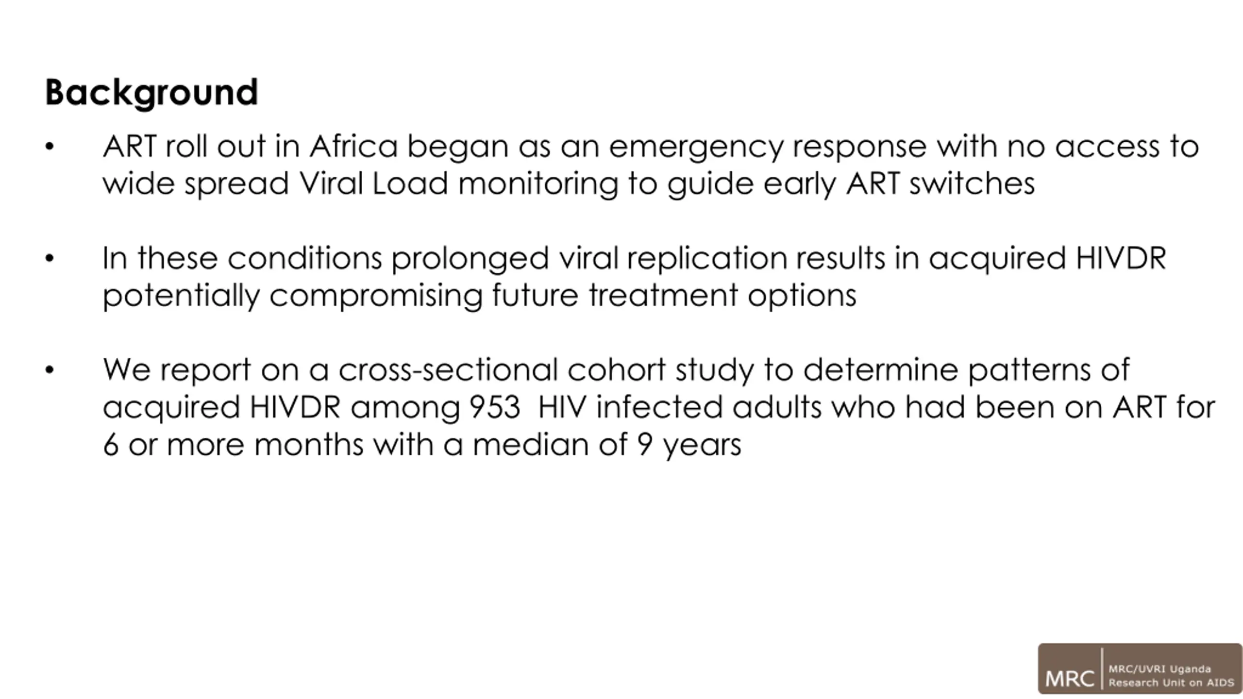 Background ART roll out in Africa began as an emergency response with no access to wide spread Viral Load monitoring to guide early ART switches In these conditions prolonged viral replication results in acquired HIVDR potentially compromising future treatment options We report on a cross-sectional cohort study to determine patterns of acquired HIVDR among 953 HIV infected adults who had been on ART for 6 or more months with a median of 9 years