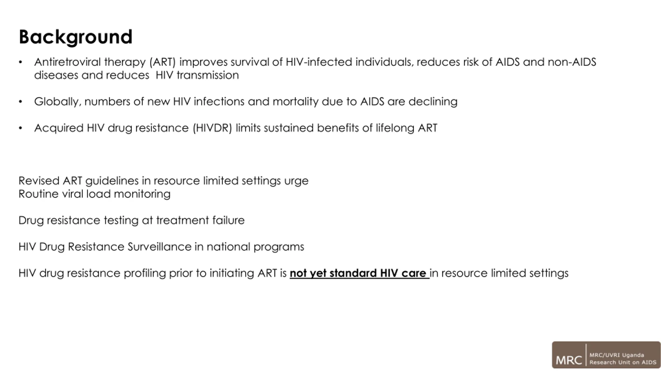 Background Antiretroviral therapy (ART) improves survival of HIV-infected individuals, reduces risk of AIDS and non-AIDS diseases and reduces HIV transmission Globally, numbers of new HIV infections and mortality due to AIDS are declining Acquired HIV drug resistance (HIVDR) limits sustained benefits of lifelong ART Revised ART guidelines in resource limited settings urge Routine viral load monitoring Drug resistance testing at treatment failure HIV Drug Resistance Surveillance in national programs HIV drug resistance profiling prior to initiating ART is not yet standard HIV care in resource limited settings