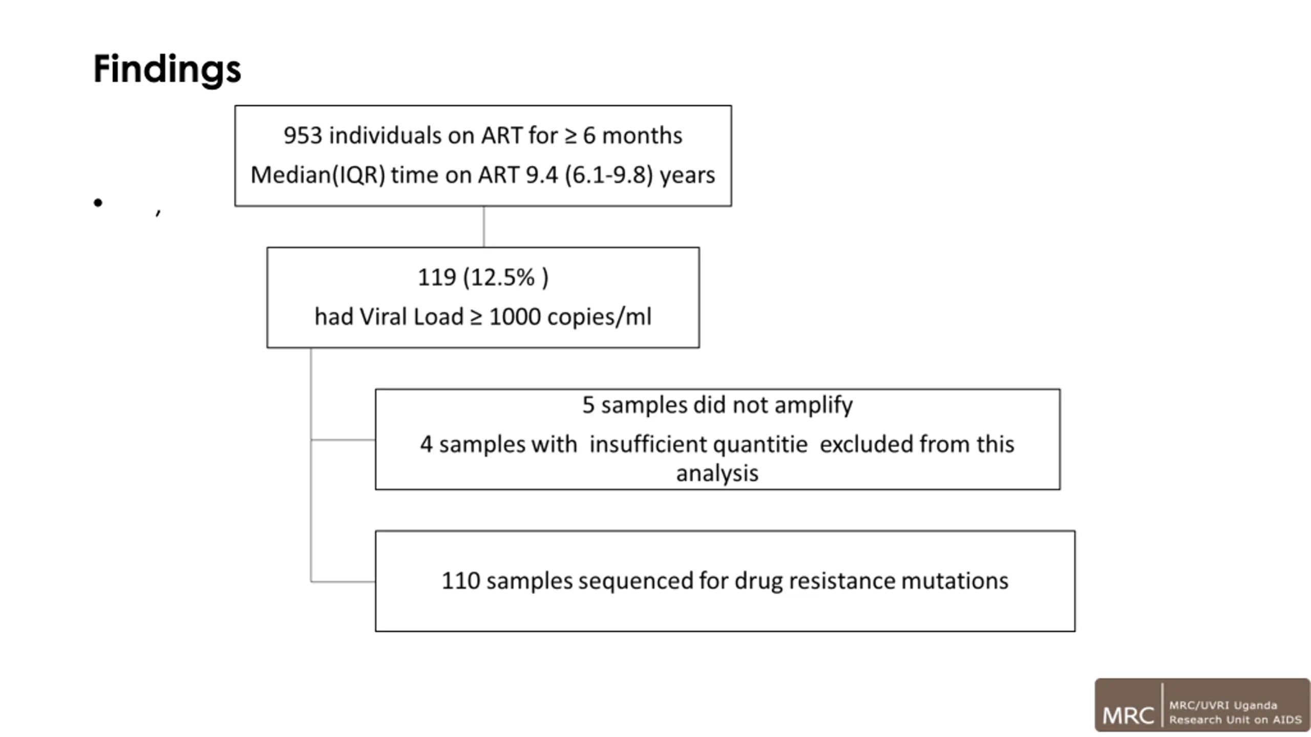 Methods A cross-sectional study of HIV-Positive adults at enrolment into a prospective clinical cohort established to study the complications of long-term ART (CoLTART). We recruited individuals from two ART cohorts; The former Development of Antiretroviral Therapy in Africa (DART) Trial cohort established in 2003, and The former Rural Clinical Cohort in south western Uganda where ART was introduced in 2004. For each subject we obtained: ART history, CD4 count and Viral Load at cohort entry Genotyping was performed on every sample with HIV RNA viral load of 1000 copies/mL
