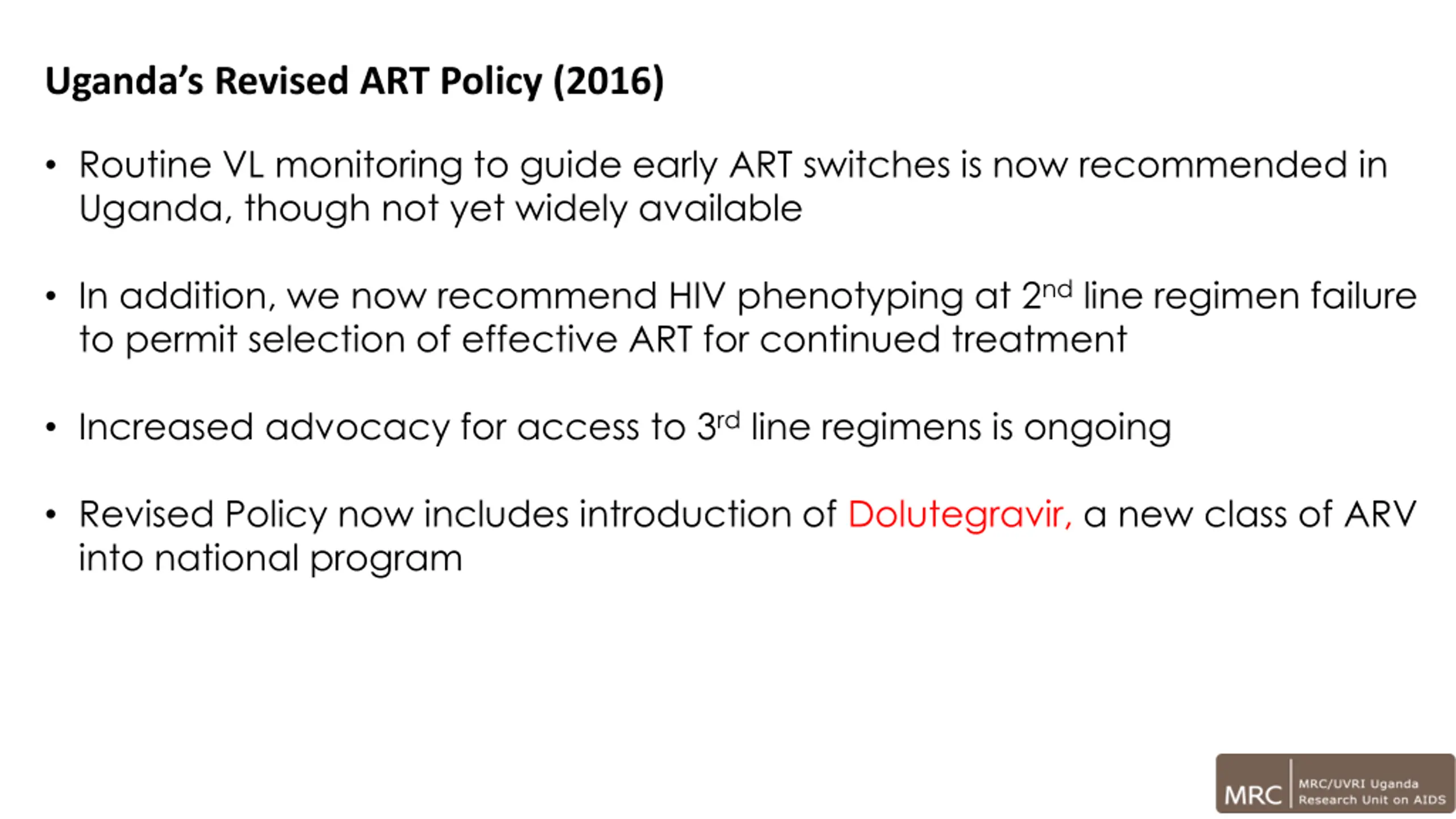 Ugandas Revised ART Policy (2016) Routine VL monitoring to guide early ART switches is now recommended in Uganda, though not yet widely available In addition, we now recommend HIV phenotyping at 2nd line regimen failure to permit selection of effective ART for continued treatment Increased advocacy for access to 3rd line regimens is ongoing Revised Policy now includes introduction of Dolutegravir, a new class of ARV into national program