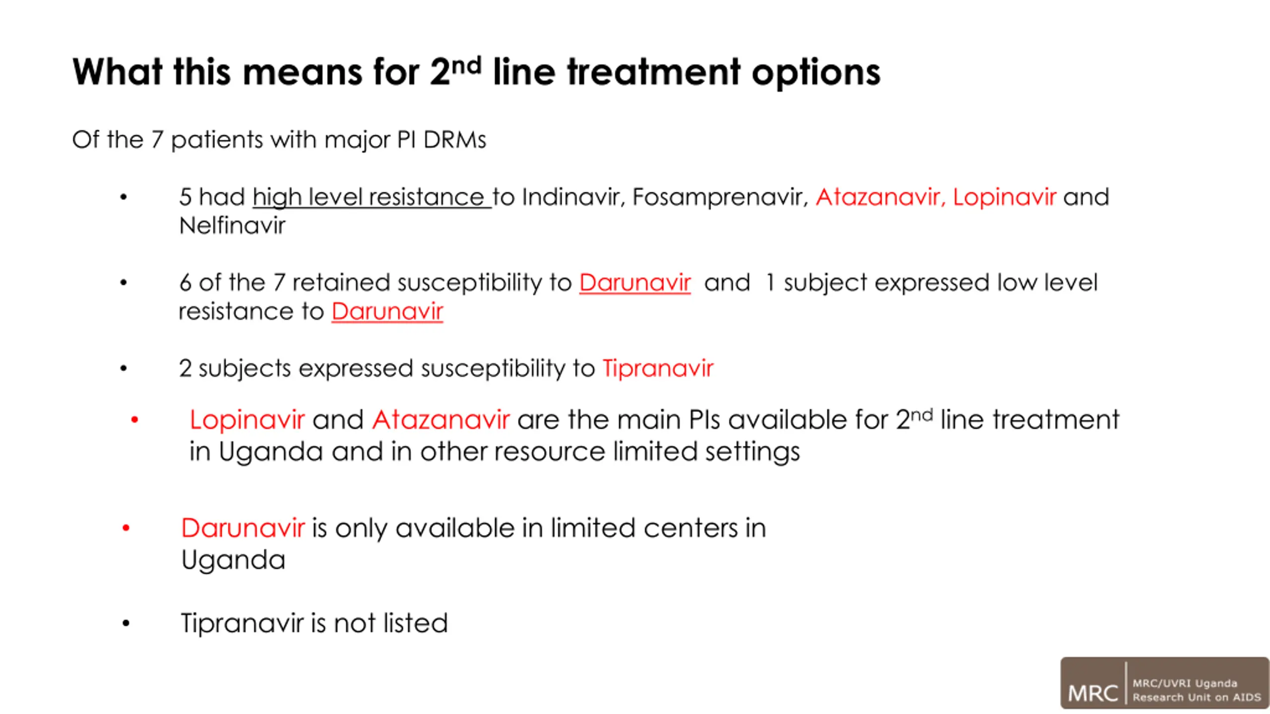 What this means for 2nd line treatment options Of the 7 patients with major PI DRMs 5 had high level resistance to Indinavir, Fosamprenavir, Atazanavir, Lopinavir and Nelfinavir 6 of the 7 retained susceptibility to Darunavir and 1 subject expressed low level resistance to Darunavir 2 subjects expressed susceptibility to Tipranavir Lopinavir and Atazanavir are the main PIs available for 2nd line treatment in Uganda and in other resource limited settings Darunavir is only available in limited centers in Uganda Tipranavir is not listed