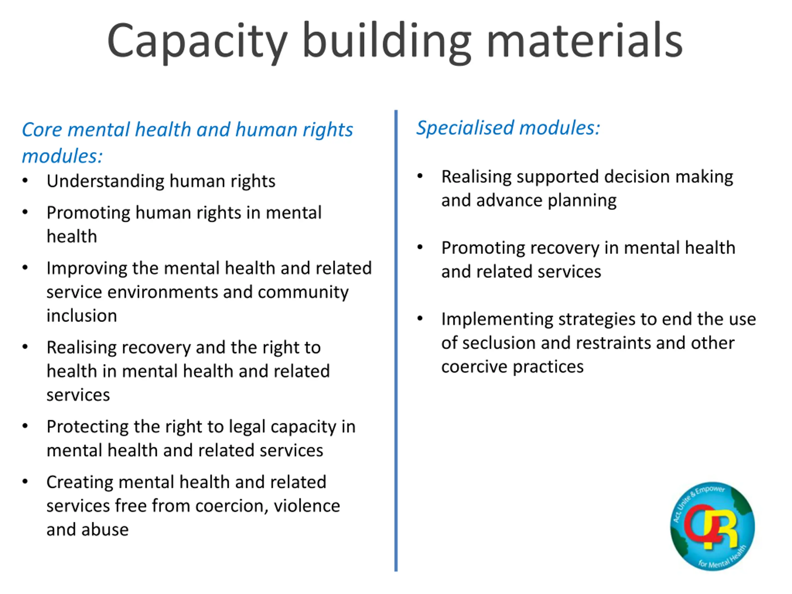 Capacity building materials Specialised modules: Core mental health and human rights modules: Understanding human rights Promoting human rights in mental health Improving the mental health and related service environments and community inclusion Realising recovery and the right to health in mental health and related services Protecting the right to legal capacity in mental health and related services Creating mental health and related services free from coercion, violence and abuse Realising supported decision making and advance planning Promoting recovery in mental health and related services Implementing strategies to end the use of seclusion and restraints and other coercive practices