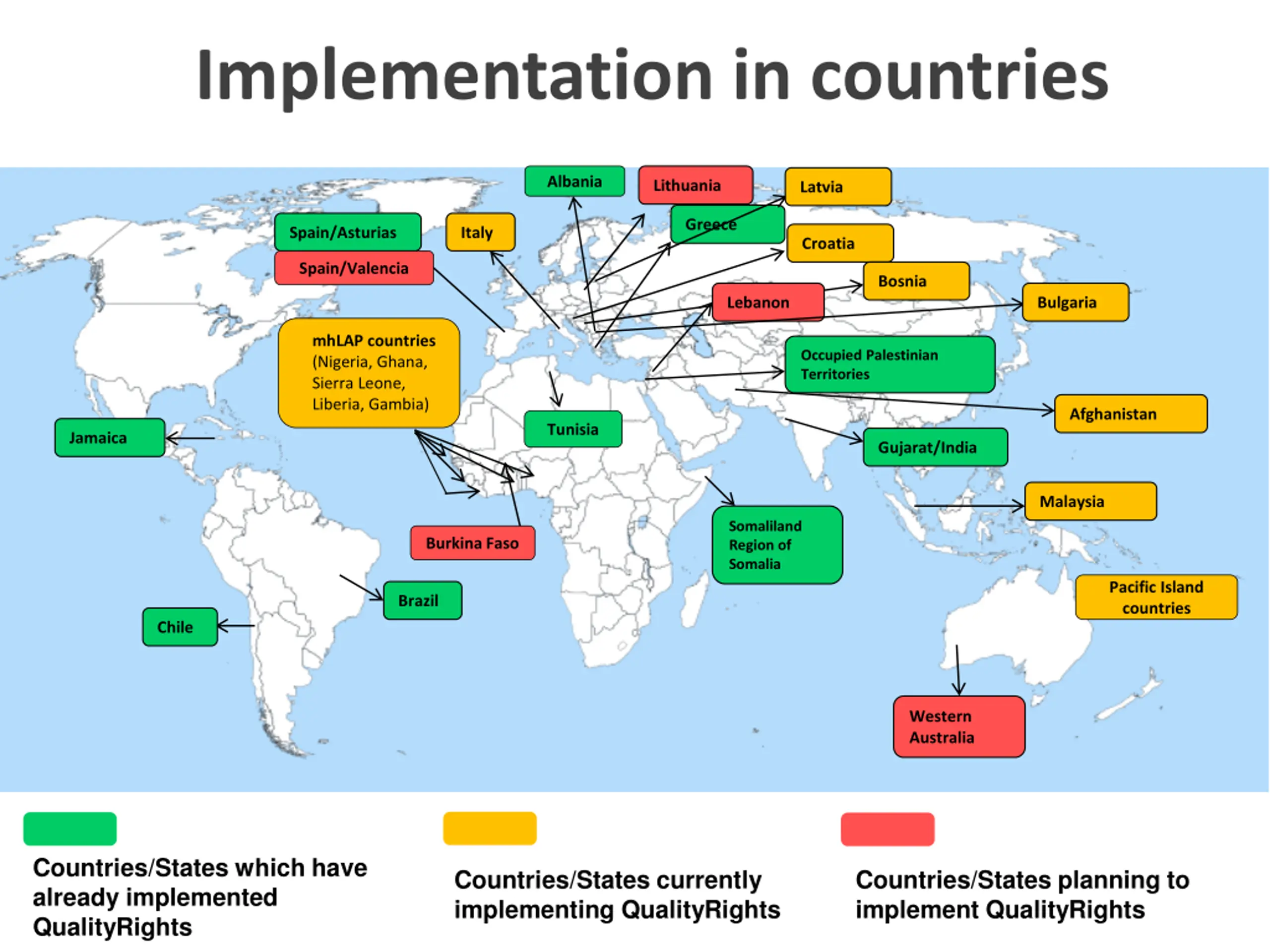 Implementation in countries Albania Lithuania Latvia Greece Spain/Asturias Italy Croatia Spain/Valencia Bosnia Lebanon Bulgaria mhLAP countries (Nigeria, Ghana, Sierra Leone, Liberia, Gambia) Occupied Palestinian Territories Afghanistan Tunisia Jamaica Gujarat/India Malaysia Somaliland Region of Somalia Burkina Faso Pacific Island countries Brazil Chile Western Australia Countries/States which have already implemented QualityRights Countries/States currently implementing QualityRights Countries/States planning to implement QualityRights