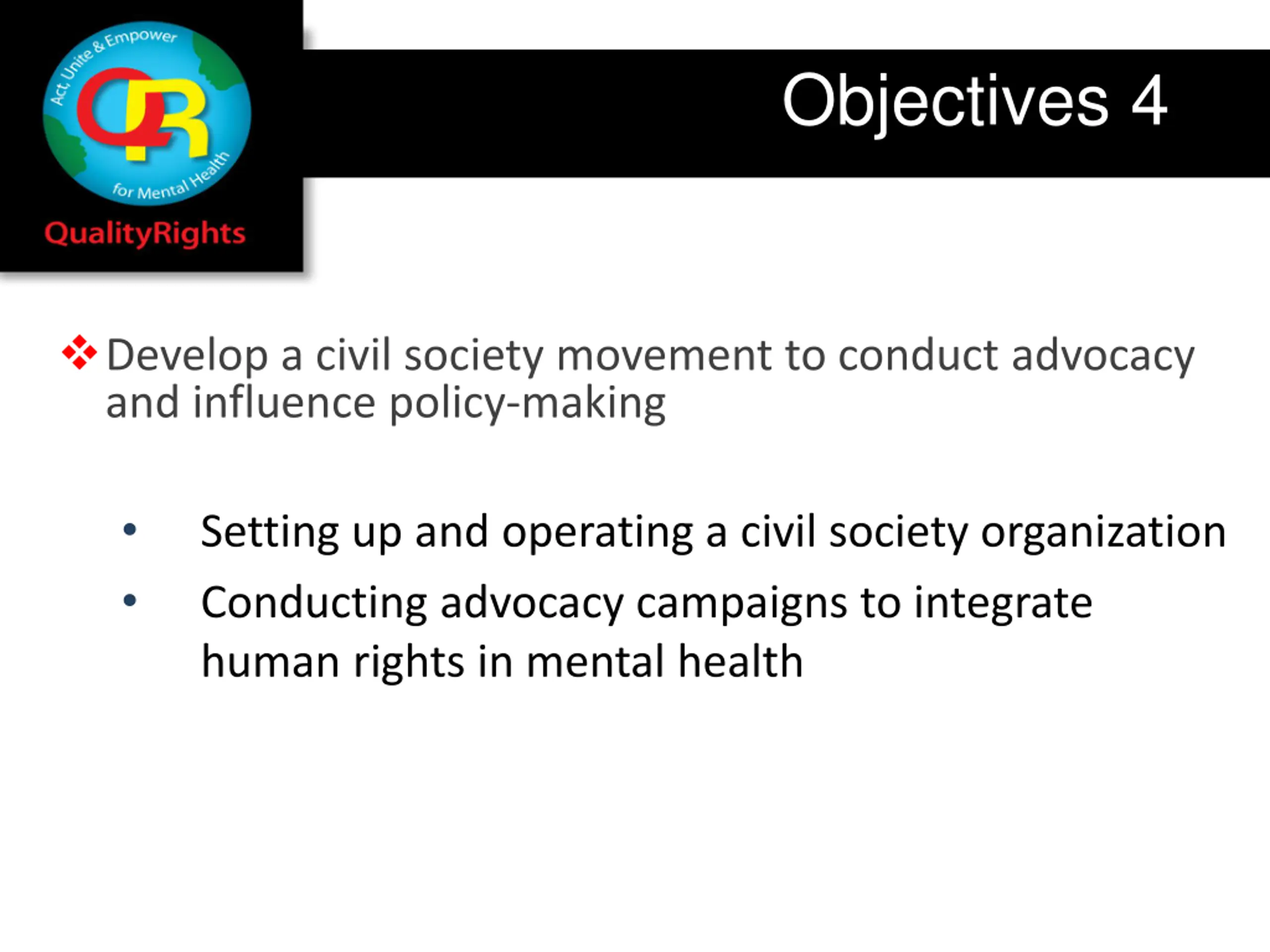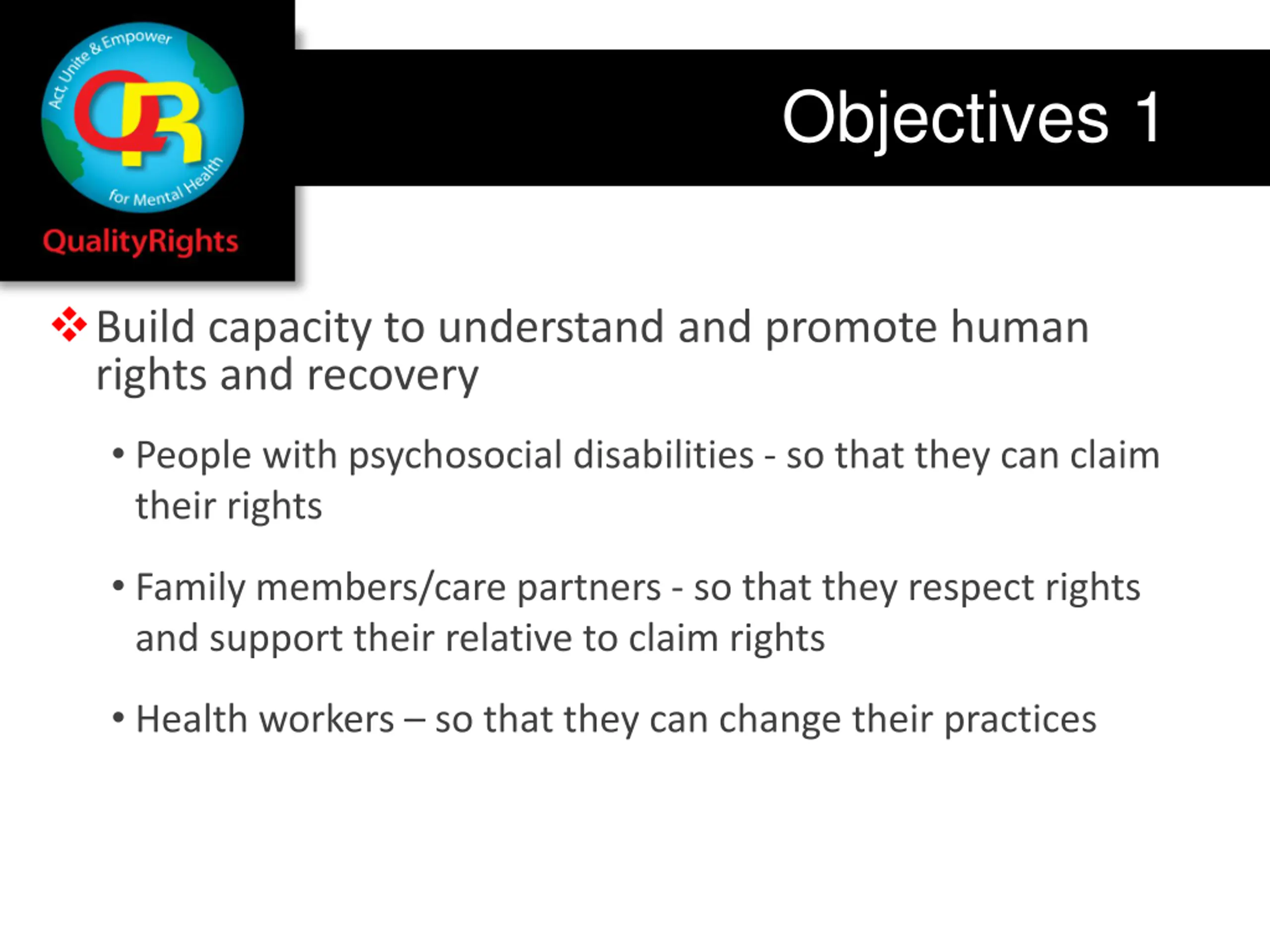 Objectives 1 Build capacity to understand and promote human rights and recovery People with psychosocial disabilities - so that they can claim their rights Family members/care partners - so that they respect rights and support their relative to claim rights Health workers so that they can change their practices