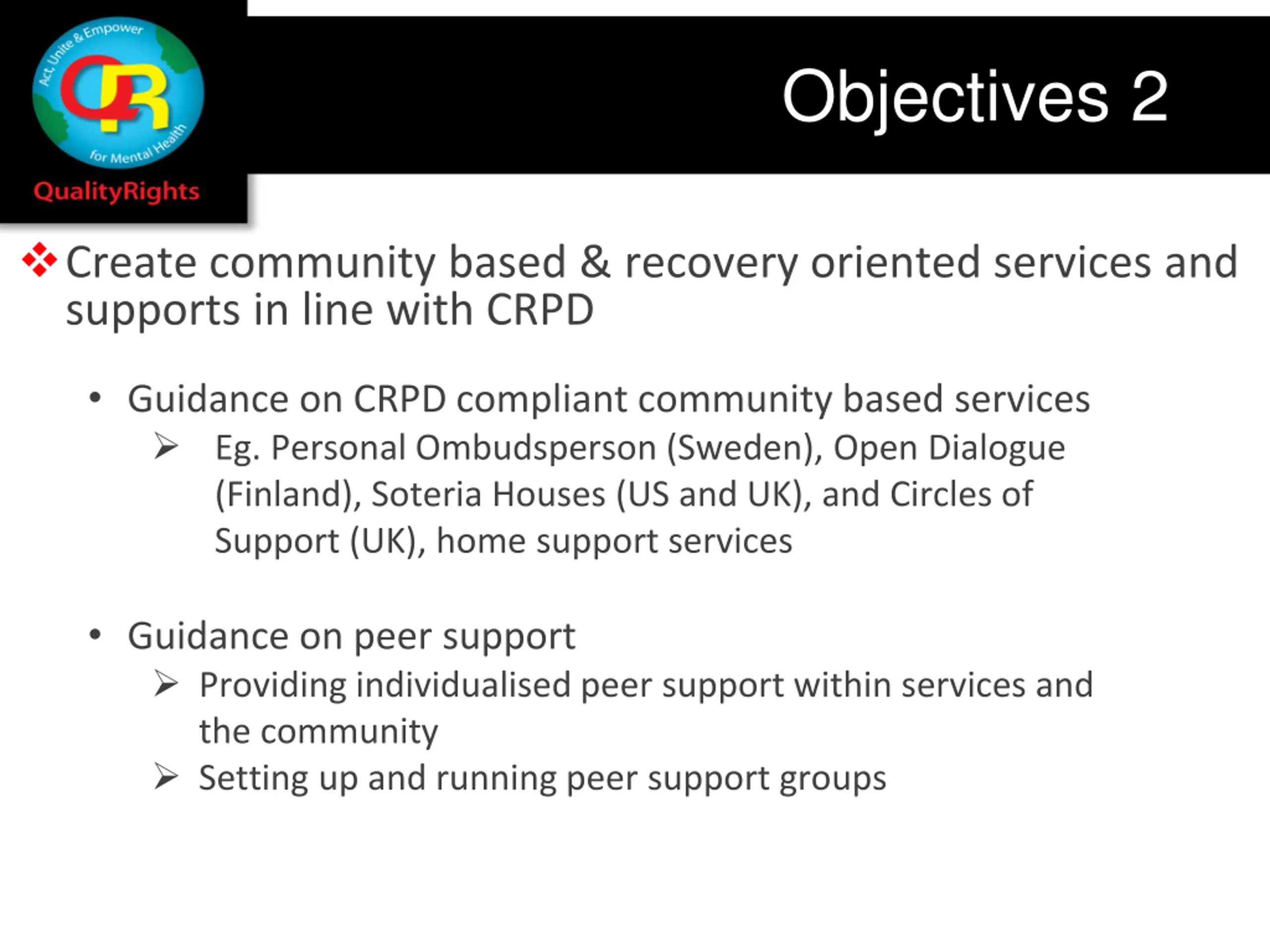 Objectives 2 Create community based & recovery oriented services and supports in line with CRPD Guidance on CRPD compliant community based services Eg. Personal Ombudsperson (Sweden), Open Dialogue (Finland), Soteria Houses (US and UK), and Circles of Support (UK), home support services Guidance on peer support Providing individualised peer support within services and the community Setting up and running peer support groups