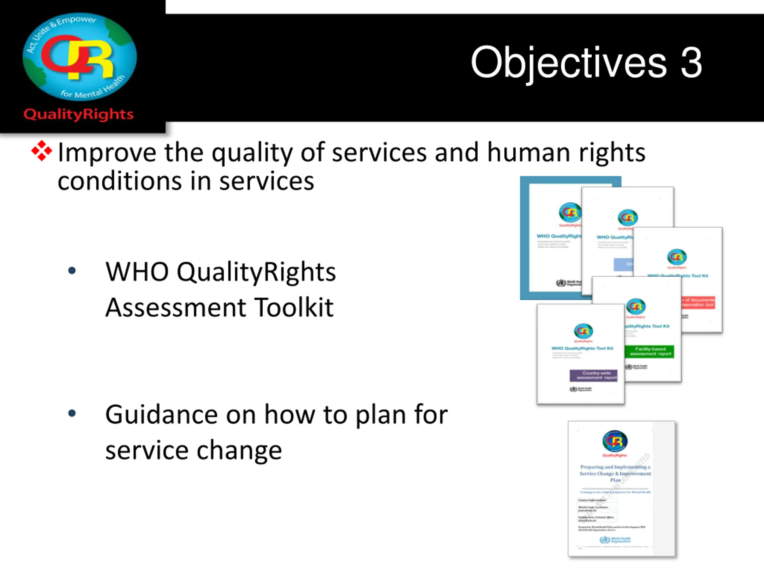 Objectives 3 Improve the quality of services and human rights conditions in services WHO QualityRights Assessment Toolkit Guidance on how to plan for service change