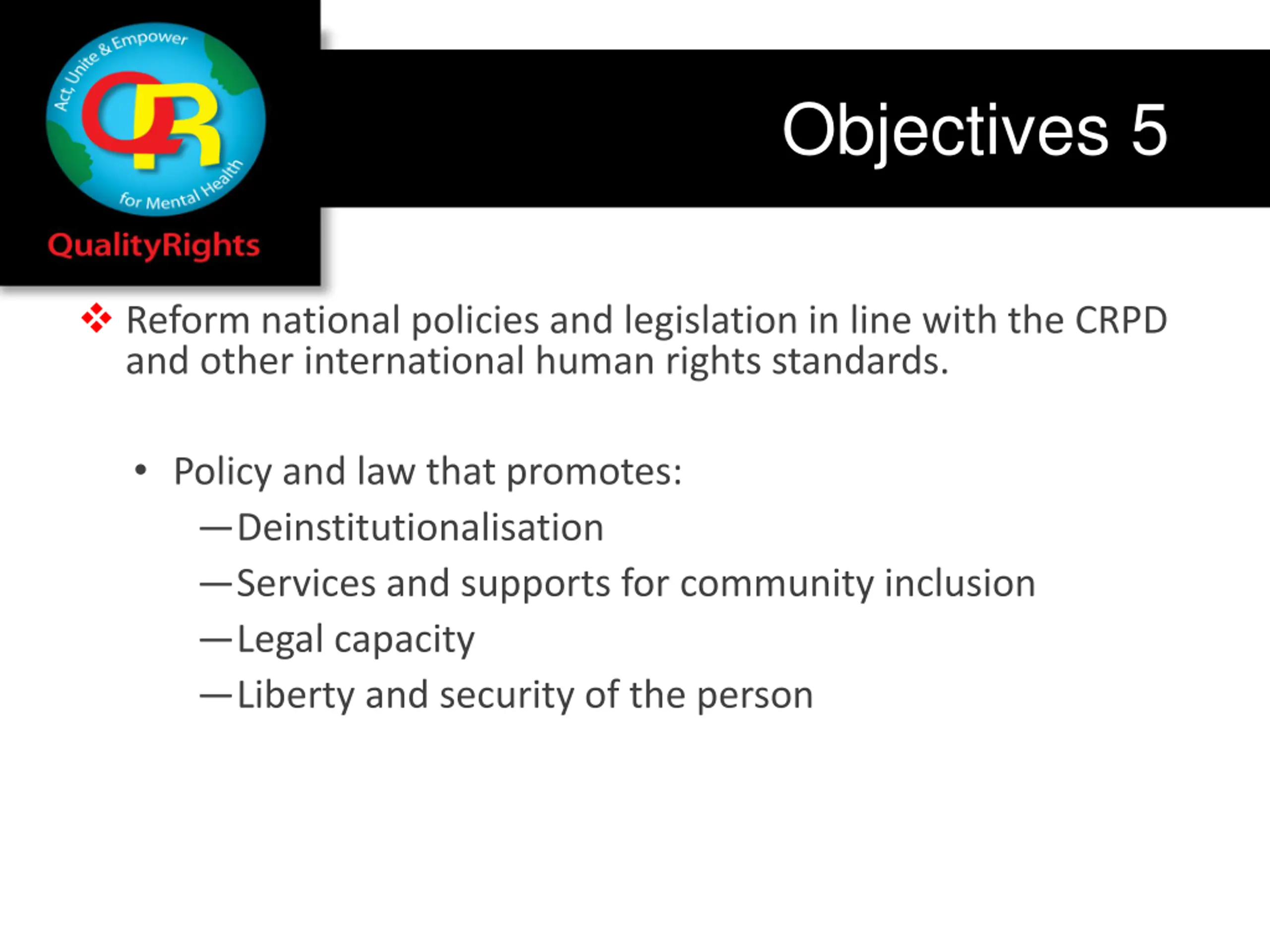 Objectives 5 Reform national policies and legislation in line with the CRPD and other international human rights standards. Policy and law that promotes: Deinstitutionalisation Services and supports for community inclusion Legal capacity Liberty and security of the person