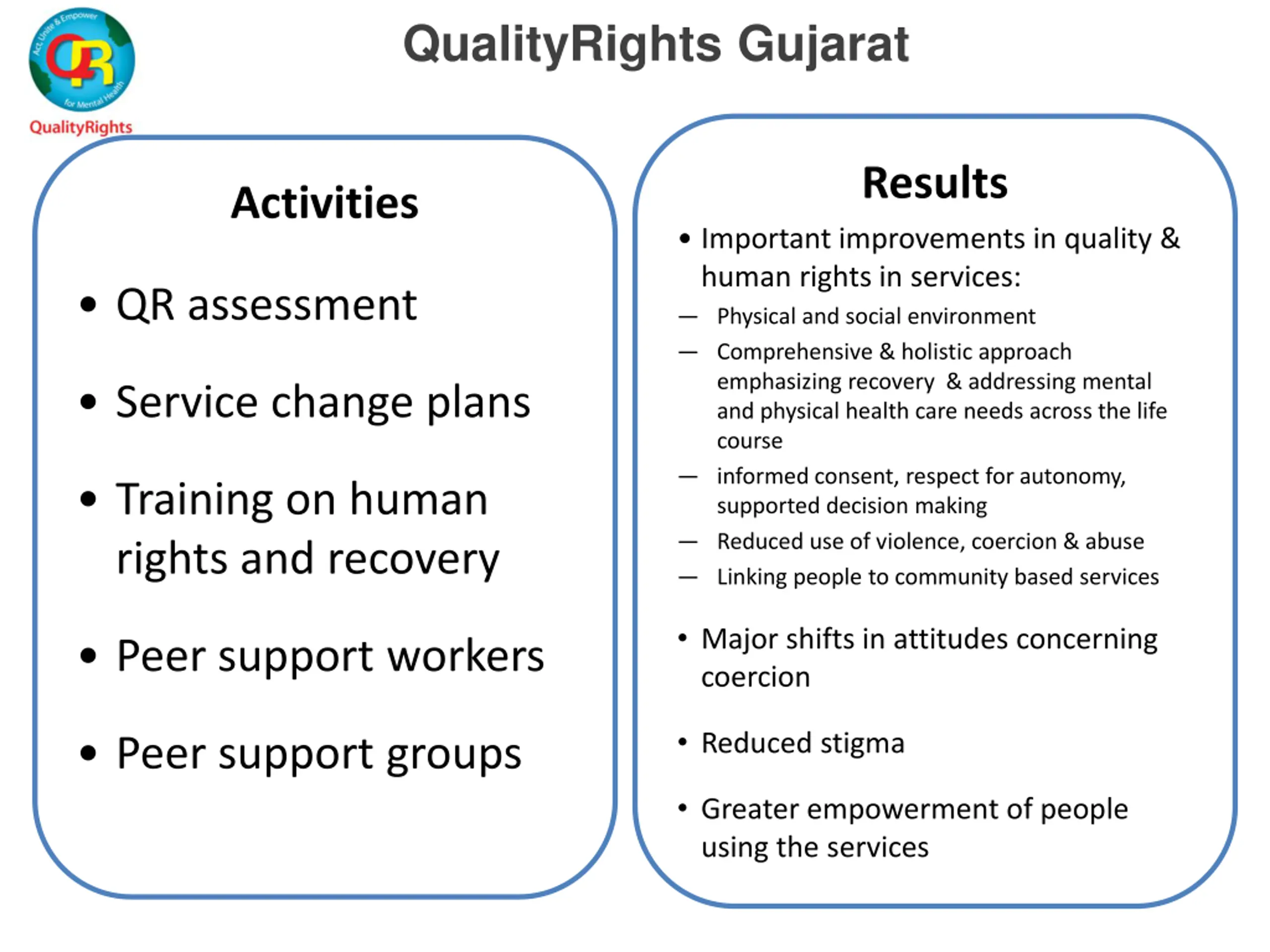 QualityRights Gujarat Results Activities Important improvements in quality & human rights in services: Physical and social environment Comprehensive & holistic approach emphasizing recovery & addressing mental and physical health care needs across the life course informed consent, respect for autonomy, supported decision making Reduced use of violence, coercion & abuse Linking people to community based services QR assessment Service change plans Training on human rights and recovery Major shifts in attitudes concerning coercion Peer support workers Reduced stigma Peer support groups Greater empowerment of people using the services