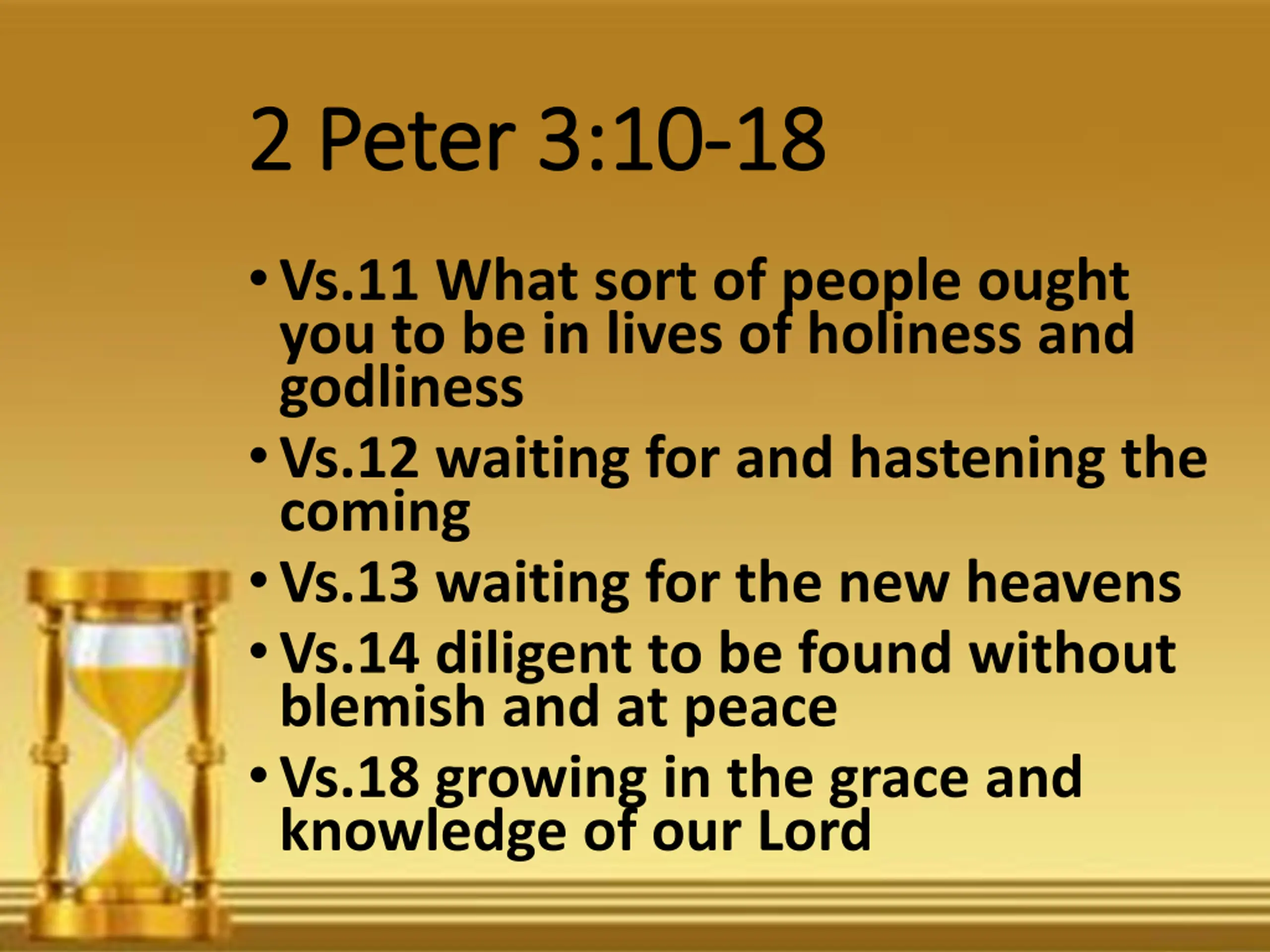 2 Peter 3:10 2 Peter 3:10- -18 18 Vs.11 What sort of people ought you to be in lives of holiness and godliness Vs.12 waiting for and hastening the coming Vs.13 waiting for the new heavens Vs.14 diligent to be found without blemish and at peace Vs.18 growing in the grace and knowledge of our Lord