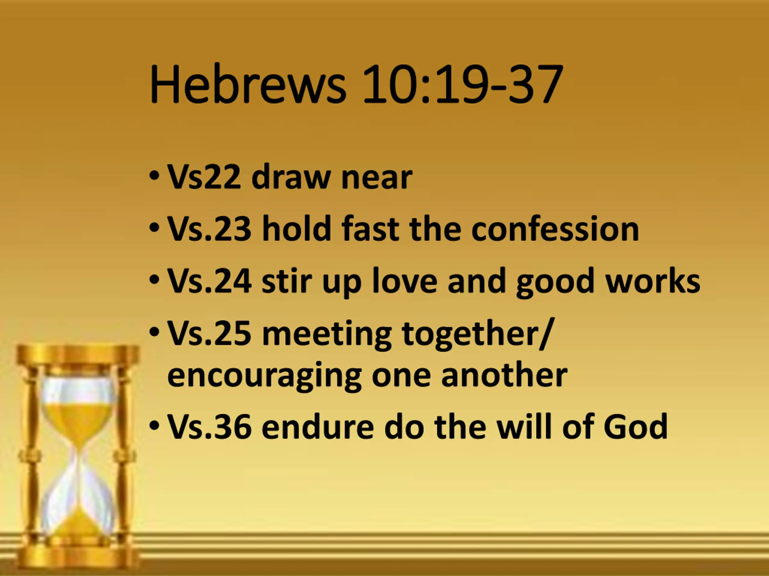 Hebrews 10:19 Hebrews 10:19- -37 37 Vs22 draw near Vs.23 hold fast the confession Vs.24 stir up love and good works Vs.25 meeting together/ encouraging one another Vs.36 endure do the will of God