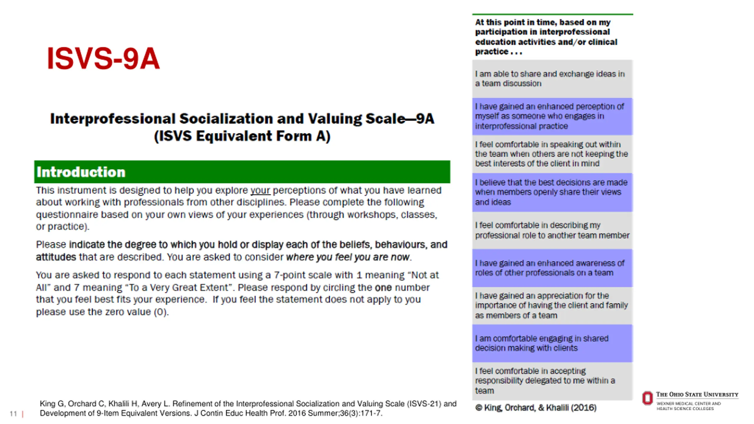 ISVS-9A King G, Orchard C, Khalili H, Avery L. Refinement of the Interprofessional Socialization and Valuing Scale (ISVS-21) and Development of 9-Item Equivalent Versions. J Contin Educ Health Prof. 2016 Summer;36(3):171-7. 11 |