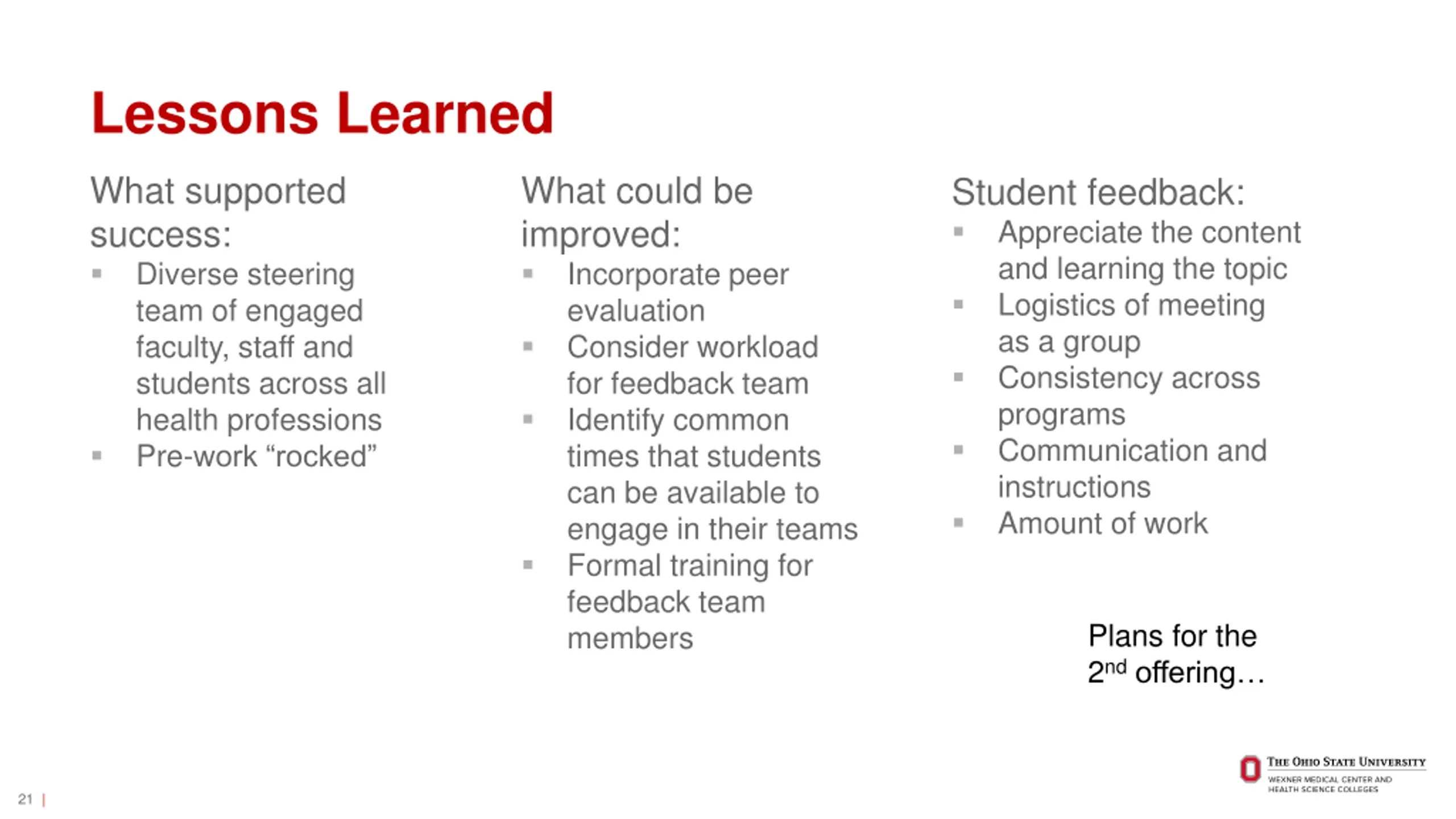 Lessons Learned What supported success: Diverse steering team of engaged faculty, staff and students across all health professions Pre-work rocked What could be improved: Incorporate peer evaluation Consider workload for feedback team Identify common times that students can be available to engage in their teams Formal training for feedback team members Student feedback: Appreciate the content and learning the topic Logistics of meeting as a group Consistency across programs Communication and instructions Amount of work Plans for the 2ndoffering 21 |