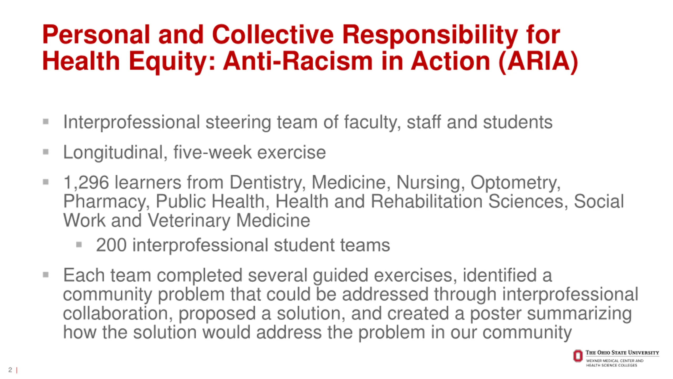 Personal and Collective Responsibility for Health Equity: Anti-Racism in Action (ARIA) Interprofessional steering team of faculty, staff and students Longitudinal, five-week exercise 1,296 learners from Dentistry, Medicine, Nursing, Optometry, Pharmacy, Public Health, Health and Rehabilitation Sciences, Social Work and Veterinary Medicine 200 interprofessional student teams Each team completed several guided exercises, identified a community problem that could be addressed through interprofessional collaboration, proposed a solution, and created a poster summarizing how the solution would address the problem in our community 2 |