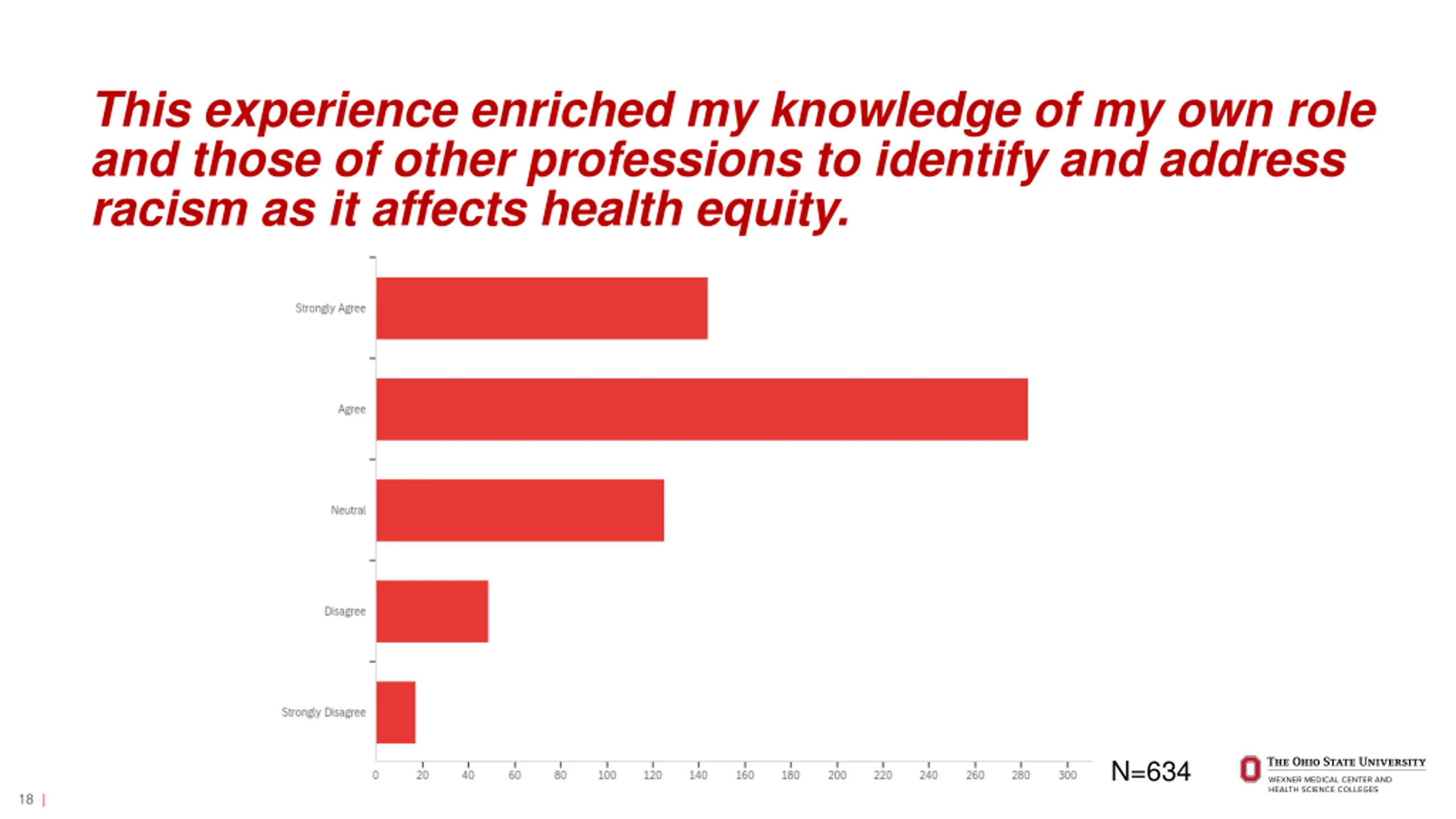 This experience enriched my knowledge of my own role and those of other professions to identify and address racism as it affects health equity. N=634 18 |