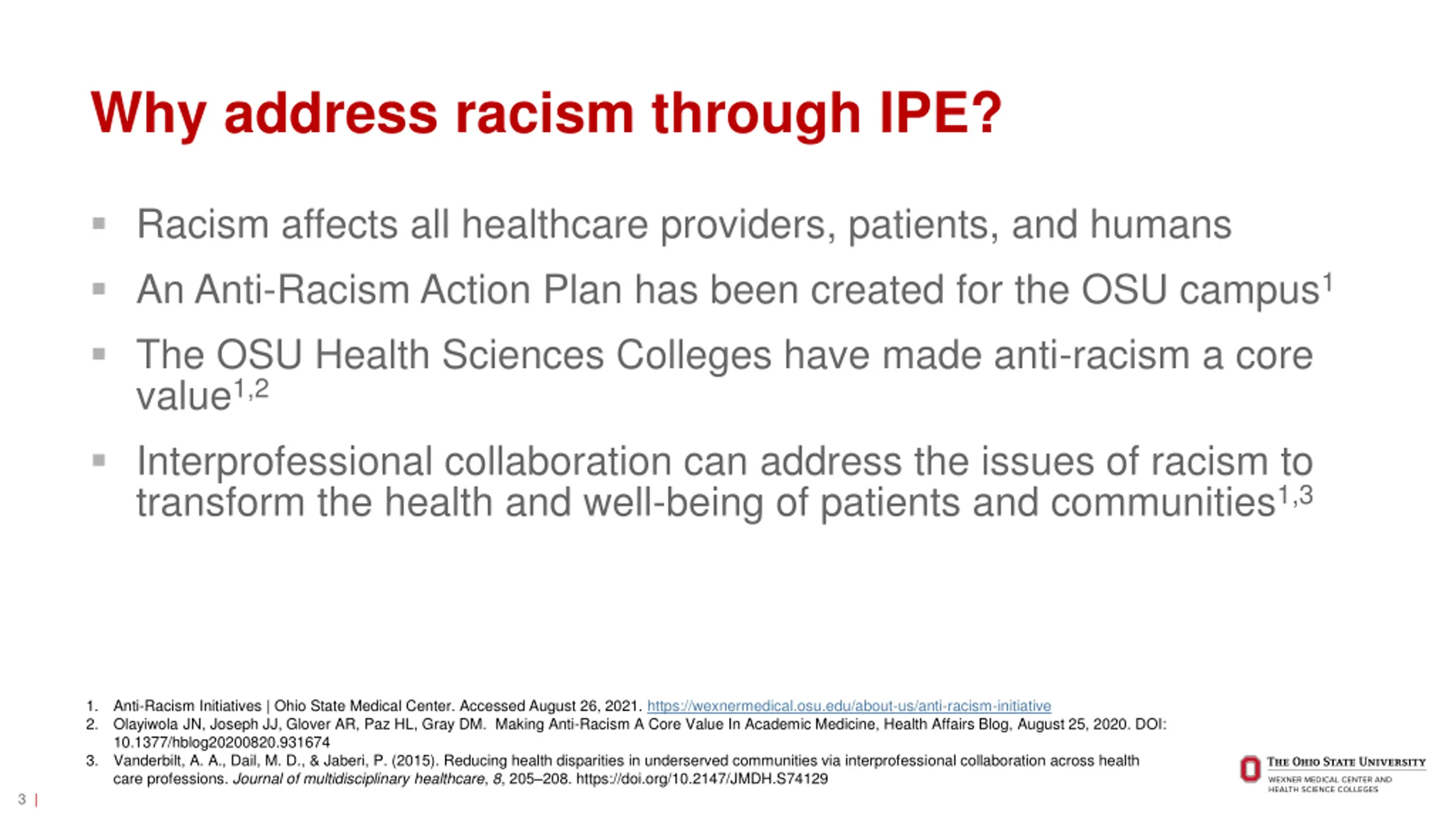 Why address racism through IPE? Racism affects all healthcare providers, patients, and humans An Anti-Racism Action Plan has been created for the OSU campus1 The OSU Health Sciences Colleges have made anti-racism a core value1,2 Interprofessional collaboration can address the issues of racism to transform the health and well-being of patients and communities1,3 1. 2. Anti-Racism Initiatives | Ohio State Medical Center. Accessed August 26, 2021. https://wexnermedical.osu.edu/about-us/anti-racism-initiative Olayiwola JN, Joseph JJ, Glover AR, Paz HL, Gray DM. Making Anti-Racism A Core Value In Academic Medicine, Health Affairs Blog, August 25, 2020. DOI: 10.1377/hblog20200820.931674 Vanderbilt, A. A., Dail, M. D., & Jaberi, P. (2015). Reducing health disparities in underserved communities via interprofessional collaboration across health care professions. Journal of multidisciplinary healthcare, 8, 205 208. https://doi.org/10.2147/JMDH.S74129 3. 3 |