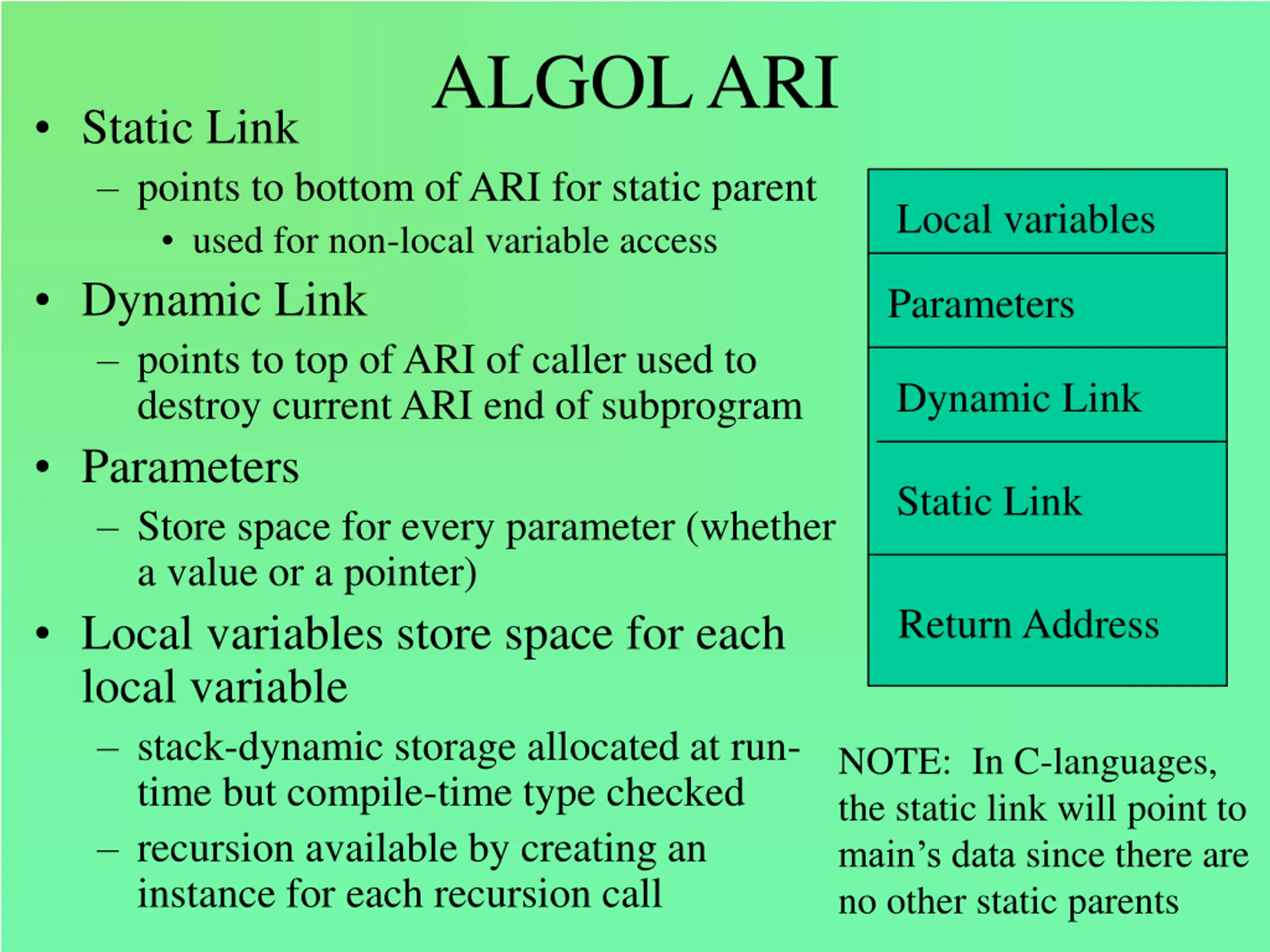 ALGOL ARI Static Link points to bottom of ARI for static parent used for non-local variable access Dynamic Link points to top of ARI of caller used to destroy current ARI end of subprogram Parameters Store space for every parameter (whether a value or a pointer) Local variables store space for each local variable stack-dynamic storage allocated at run- time but compile-time type checked recursion available by creating an instance for each recursion call Local variables Parameters Dynamic Link Static Link Return Address NOTE: In C-languages, the static link will point to main s data since there are no other static parents