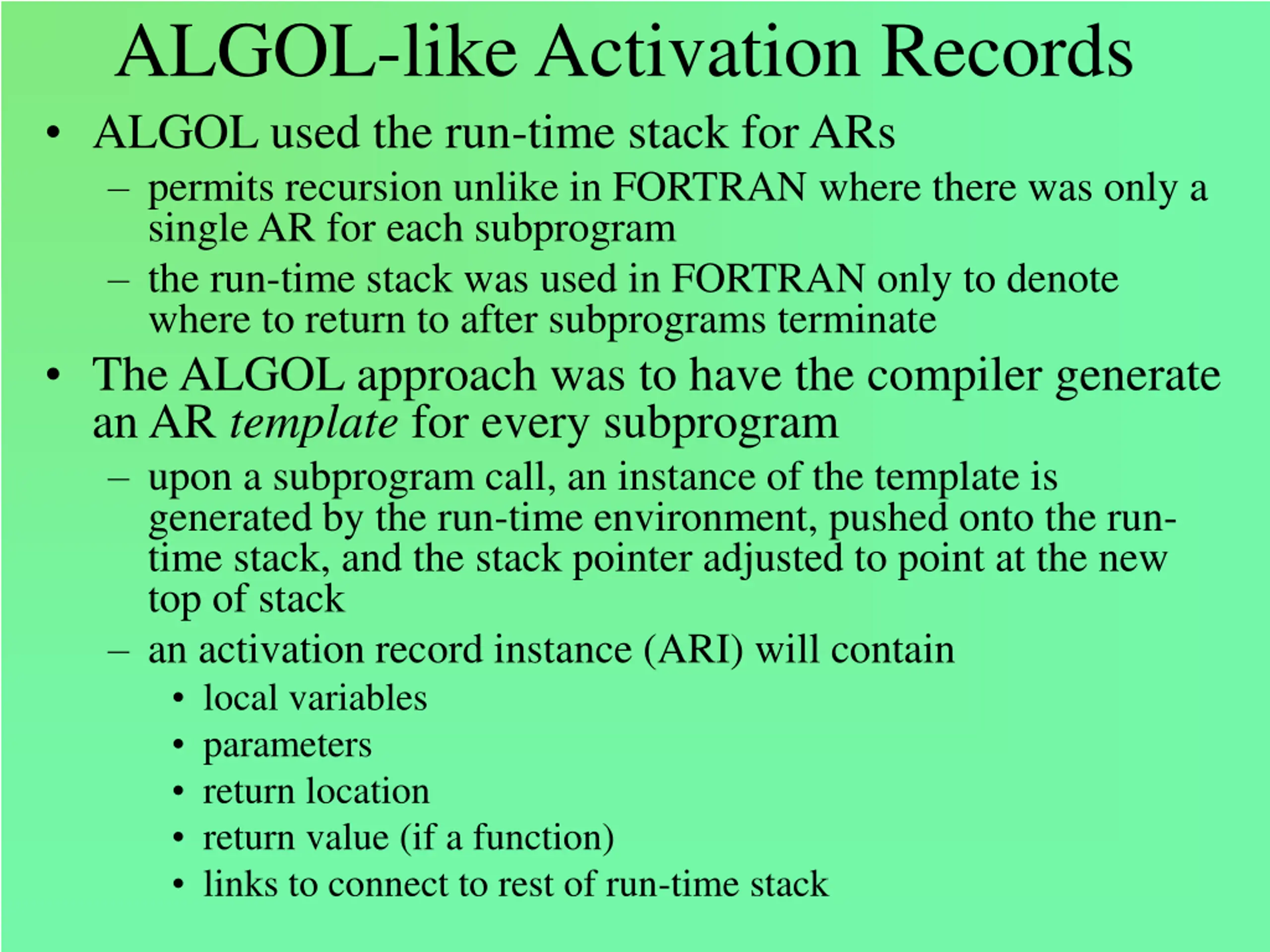 ALGOL-like Activation Records ALGOL used the run-time stack for ARs permits recursion unlike in FORTRAN where there was only a single AR for each subprogram the run-time stack was used in FORTRAN only to denote where to return to after subprograms terminate The ALGOL approach was to have the compiler generate an AR template for every subprogram upon a subprogram call, an instance of the template is generated by the run-time environment, pushed onto the run- time stack, and the stack pointer adjusted to point at the new top of stack an activation record instance (ARI) will contain local variables parameters return location return value (if a function) links to connect to rest of run-time stack