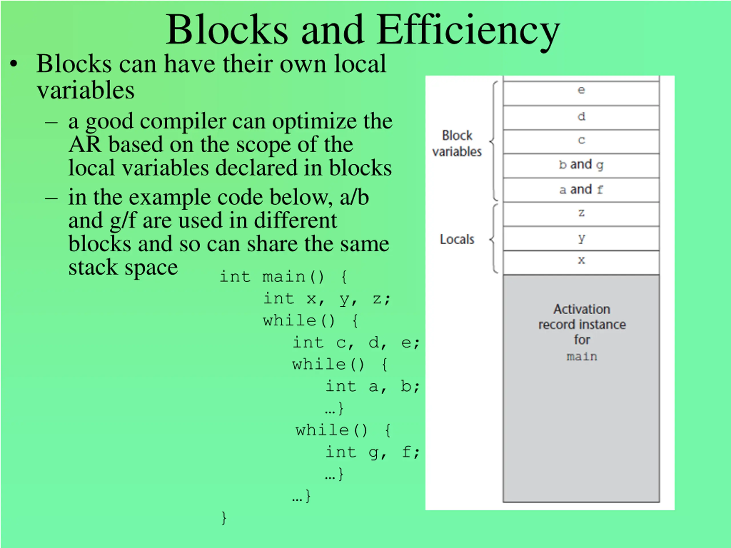 Blocks and Efficiency Blocks can have their own local variables a good compiler can optimize the AR based on the scope of the local variables declared in blocks in the example code below, a/b and g/f are used in different blocks and so can share the same stack space int main() { int x, y, z; while() { while() { } int c, d, e; while() { int a, b; } int g, f; } }