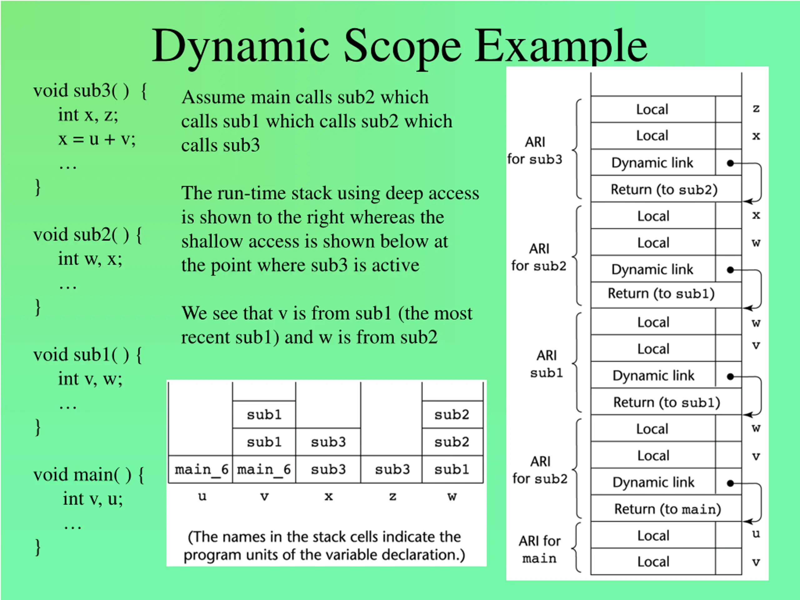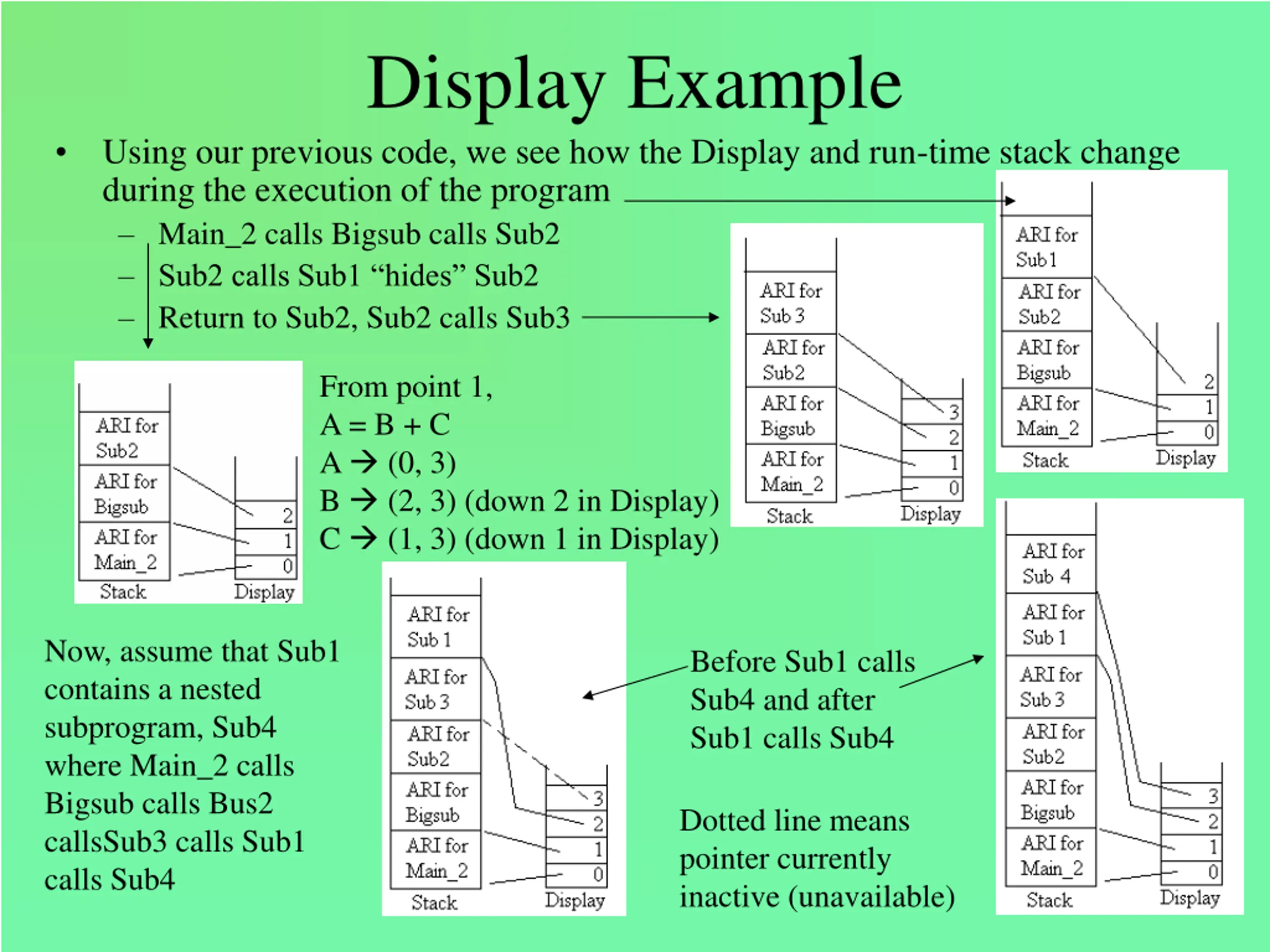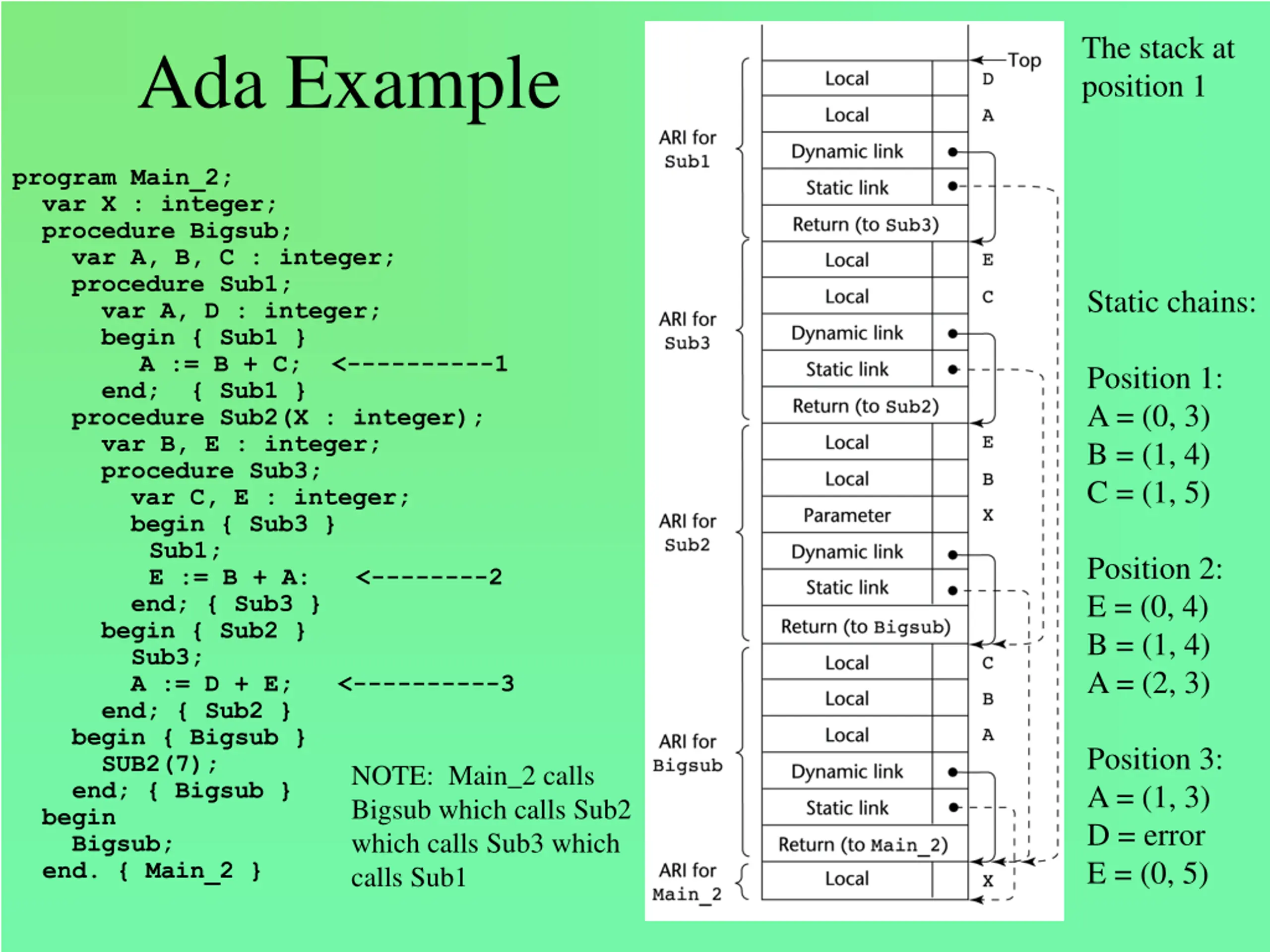 The stack at position 1 Ada Example program Main_2; var X : integer; procedure Bigsub; var A, B, C : integer; procedure Sub1; var A, D : integer; begin { Sub1 } A := B + C; <----------1 end; { Sub1 } procedure Sub2(X : integer); var B, E : integer; procedure Sub3; var C, E : integer; begin { Sub3 } Sub1; E := B + A: <--------2 end; { Sub3 } begin { Sub2 } Sub3; A := D + E; <----------3 end; { Sub2 } begin { Bigsub } SUB2(7); end; { Bigsub } begin Bigsub; end. { Main_2 } Static chains: Position 1: A = (0, 3) B = (1, 4) C = (1, 5) Position 2: E = (0, 4) B = (1, 4) A = (2, 3) Position 3: A = (1, 3) D = error E = (0, 5) NOTE: Main_2 calls Bigsub which calls Sub2 which calls Sub3 which calls Sub1