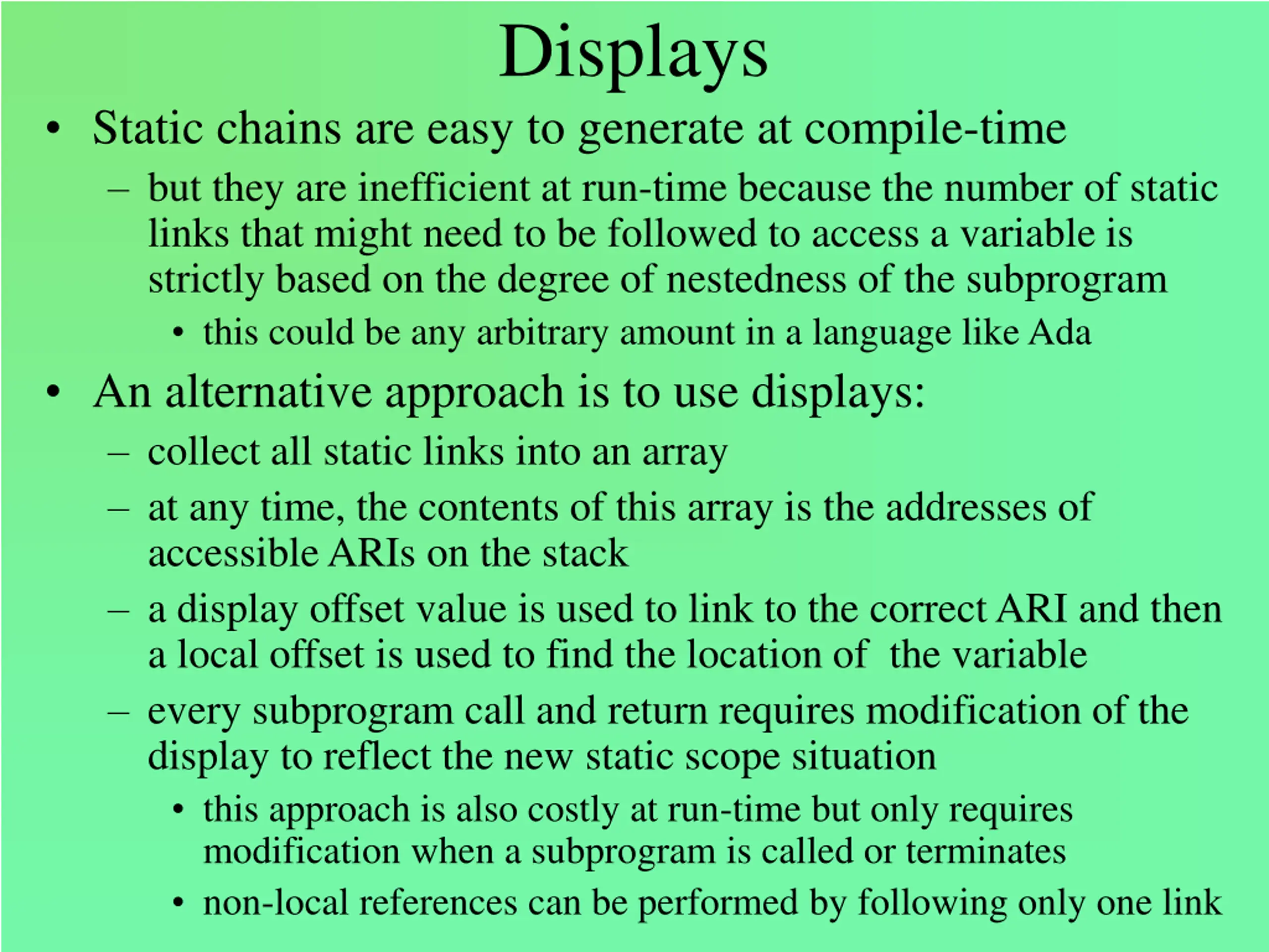 Displays Static chains are easy to generate at compile-time but they are inefficient at run-time because the number of static links that might need to be followed to access a variable is strictly based on the degree of nestedness of the subprogram this could be any arbitrary amount in a language like Ada An alternative approach is to use displays: collect all static links into an array at any time, the contents of this array is the addresses of accessible ARIs on the stack a display offset value is used to link to the correct ARI and then a local offset is used to find the location of the variable every subprogram call and return requires modification of the display to reflect the new static scope situation this approach is also costly at run-time but only requires modification when a subprogram is called or terminates non-local references can be performed by following only one link