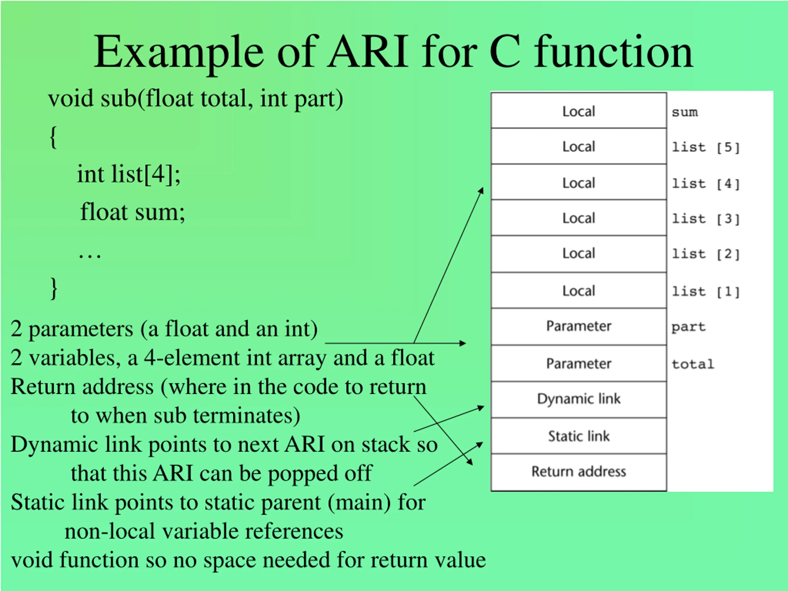 Example of ARI for C function void sub(float total, int part) { int list[4]; float sum; } 2 parameters (a float and an int) 2 variables, a 4-element int array and a float Return address (where in the code to return to when sub terminates) Dynamic link points to next ARI on stack so that this ARI can be popped off Static link points to static parent (main) for non-local variable references void function so no space needed for return value