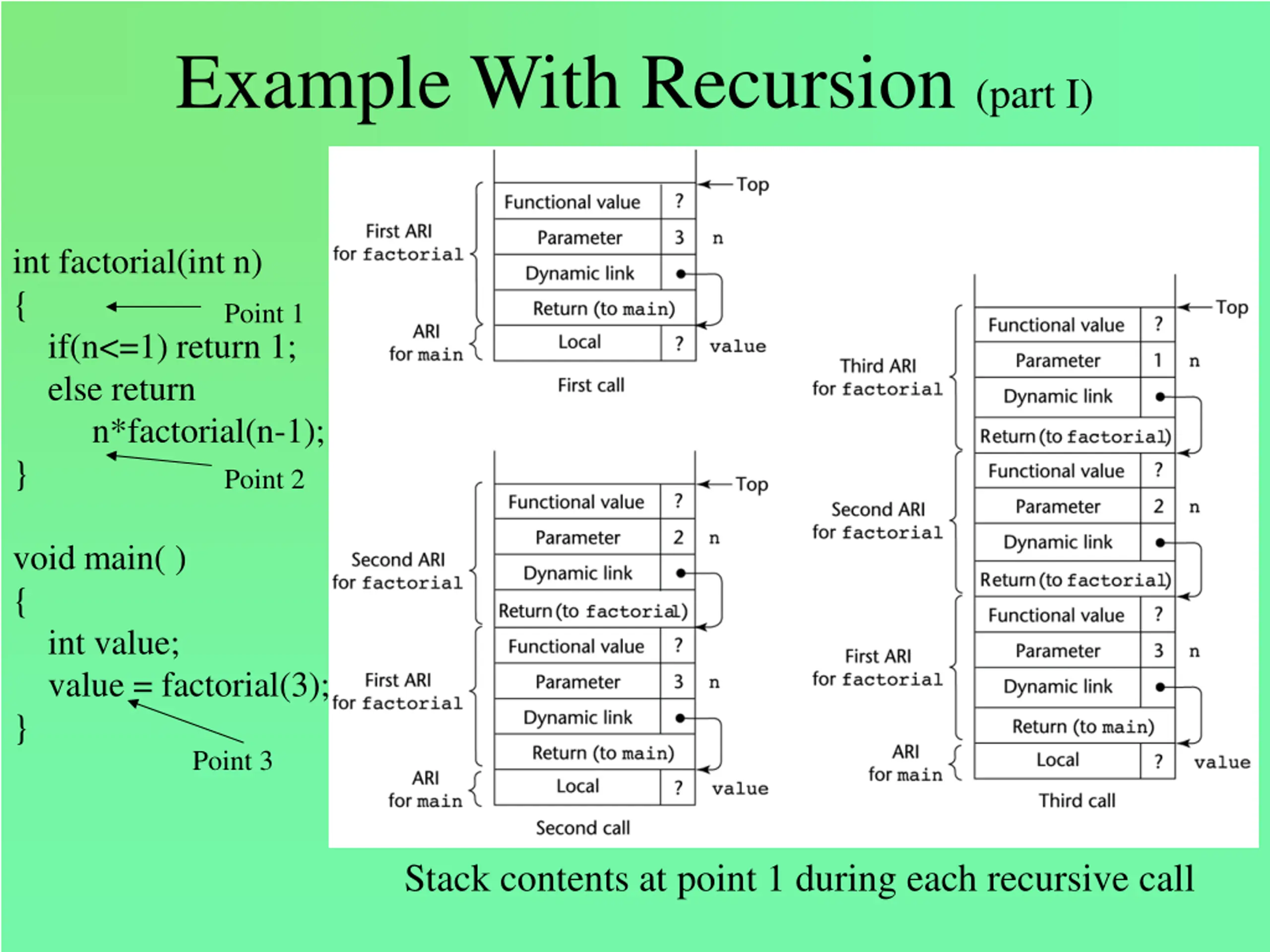 Example With Recursion (part I) int factorial(int n) { if(n<=1) return 1; else return n*factorial(n-1); } Point 1 Point 2 void main( ) { int value; value = factorial(3); } Point 3 Stack contents at point 1 during each recursive call