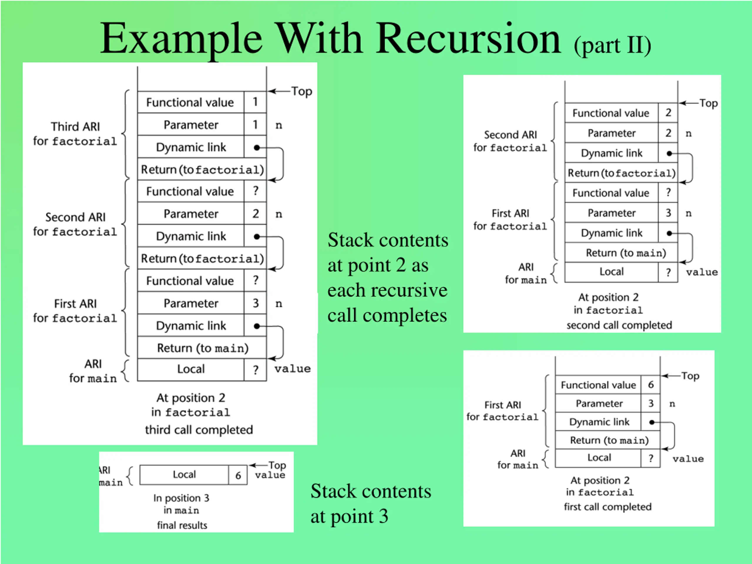 Example With Recursion (part II) Stack contents at point 2 as each recursive call completes Stack contents at point 3