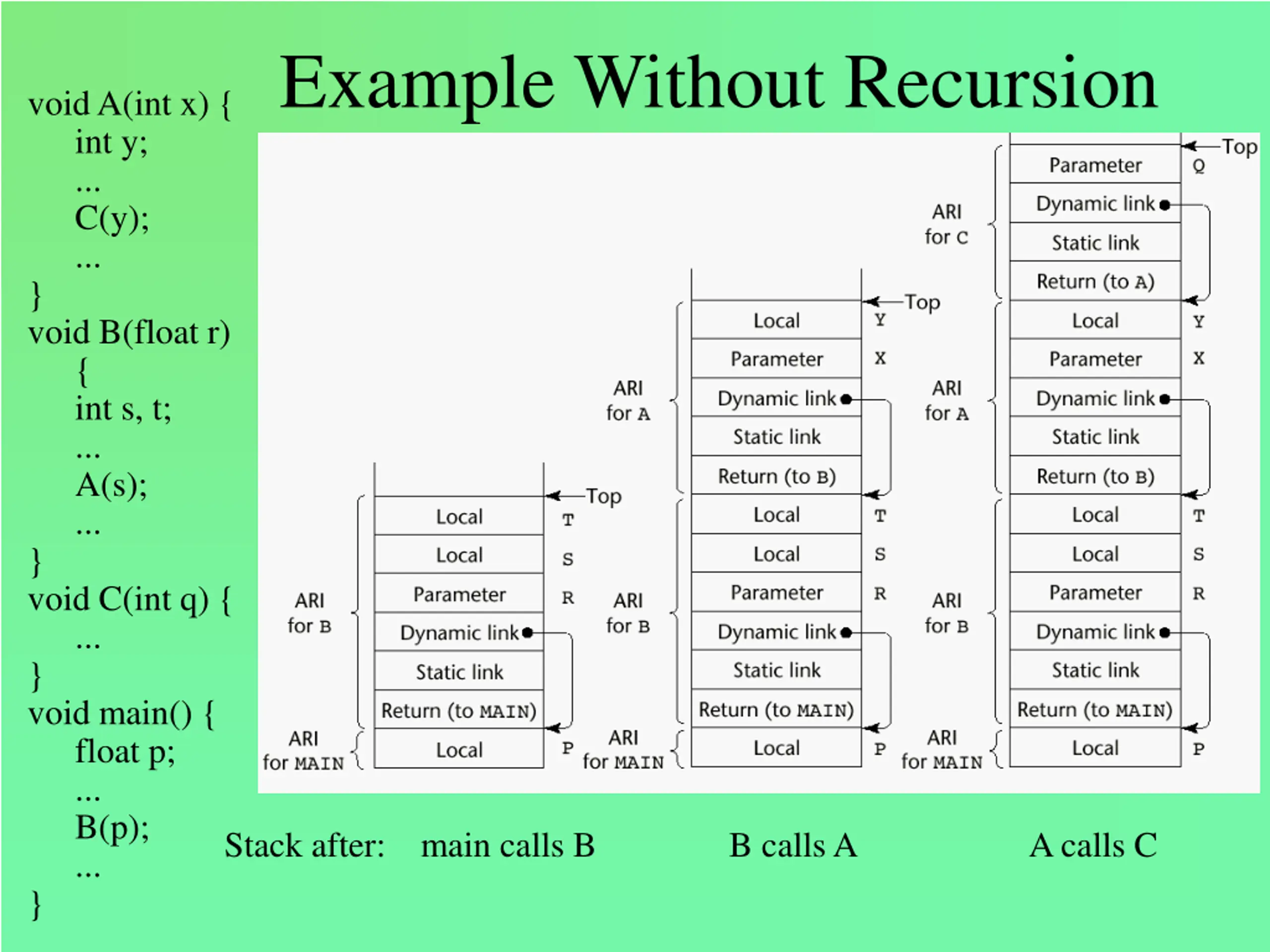 Example Without Recursion void A(int x) { int y; ... C(y); ... } void B(float r) { int s, t; ... A(s); ... } void C(int q) { ... } void main() { float p; ... B(p); ... } Stack after: main calls B B calls A A calls C