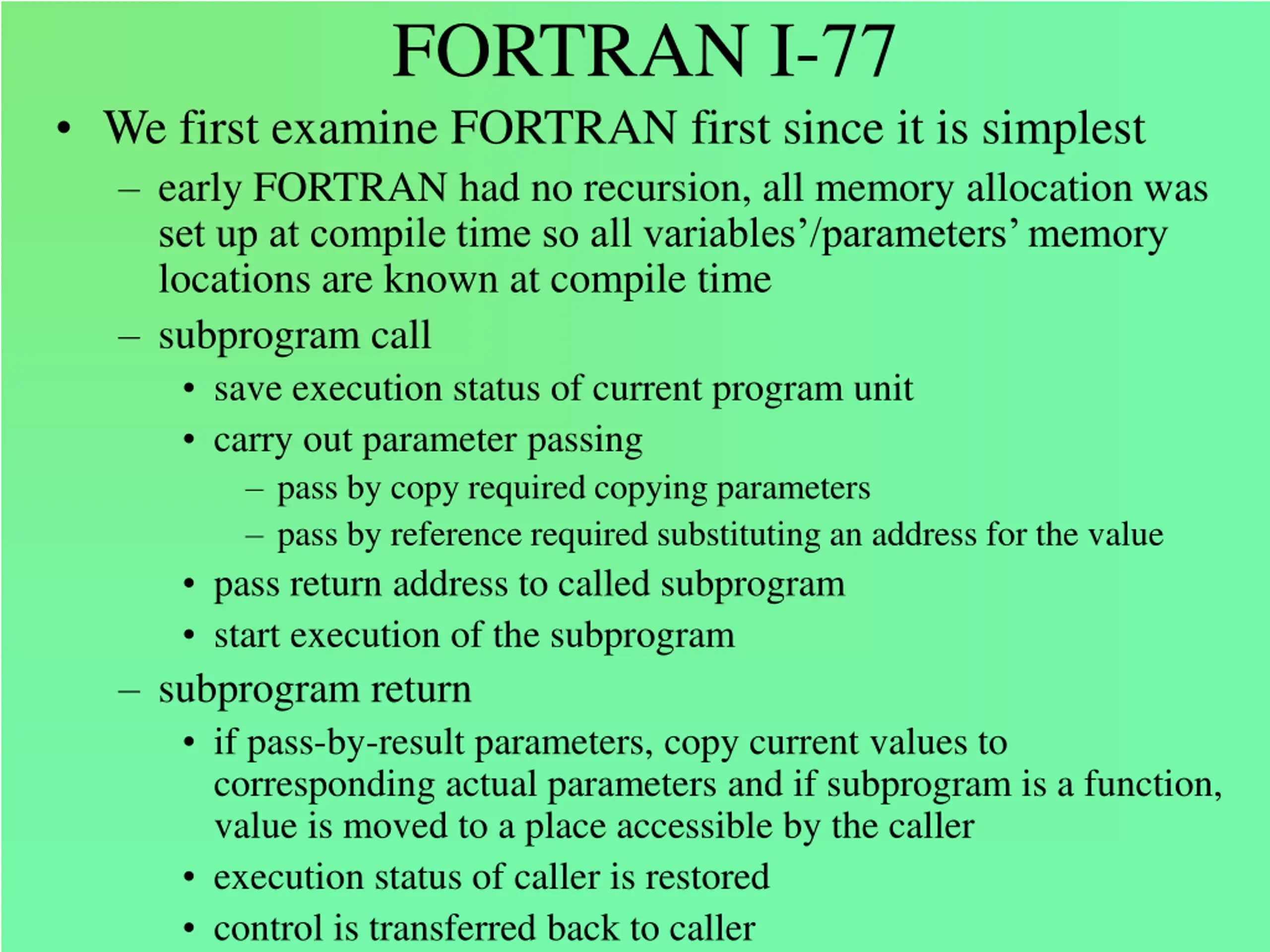 FORTRAN I-77 We first examine FORTRAN first since it is simplest early FORTRAN had no recursion, all memory allocation was set up at compile time so all variables /parameters memory locations are known at compile time subprogram call save execution status of current program unit carry out parameter passing pass by copy required copying parameters pass by reference required substituting an address for the value pass return address to called subprogram start execution of the subprogram subprogram return if pass-by-result parameters, copy current values to corresponding actual parameters and if subprogram is a function, value is moved to a place accessible by the caller execution status of caller is restored control is transferred back to caller
