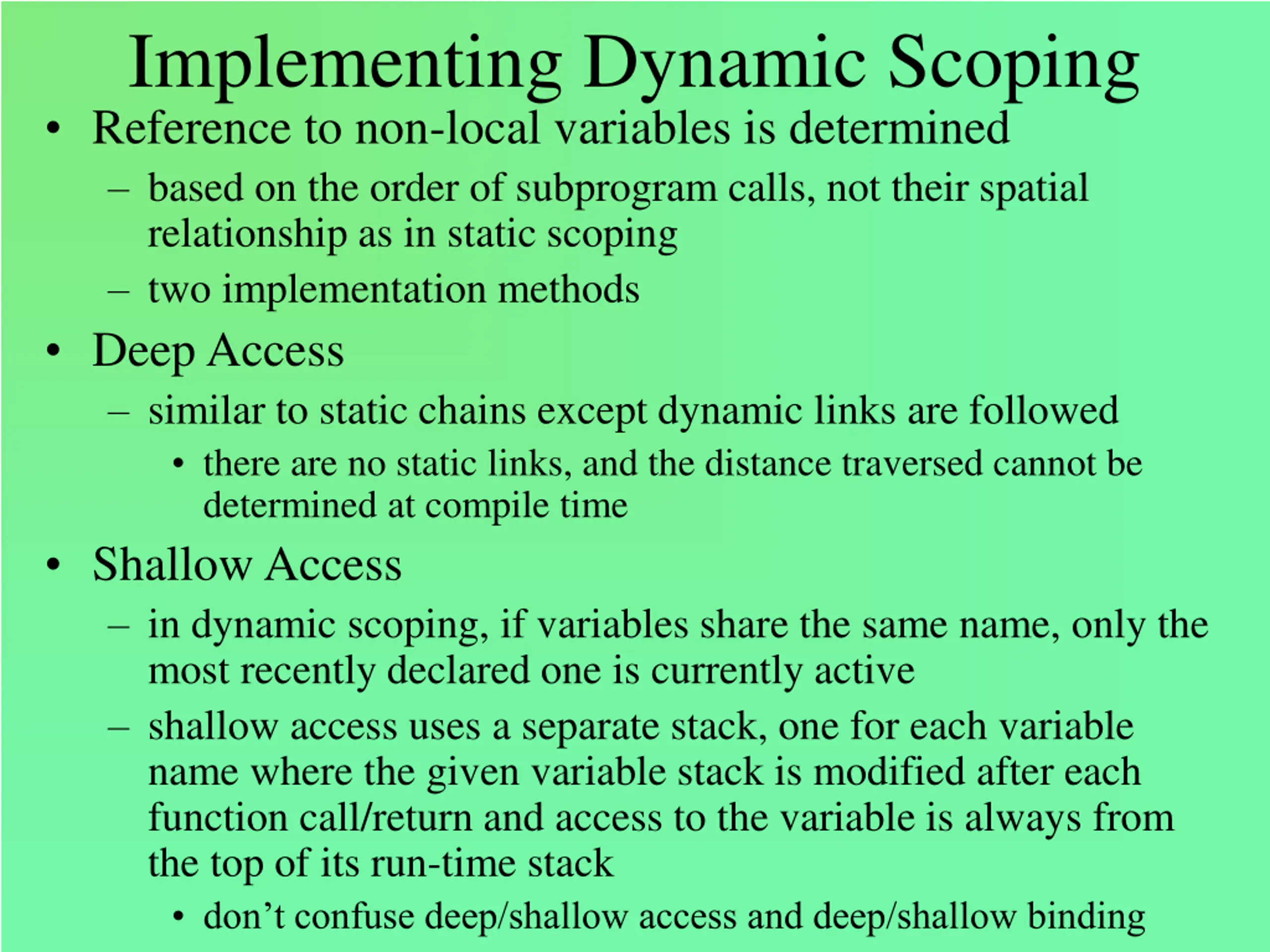 Implementing Dynamic Scoping Reference to non-local variables is determined based on the order of subprogram calls, not their spatial relationship as in static scoping two implementation methods Deep Access similar to static chains except dynamic links are followed there are no static links, and the distance traversed cannot be determined at compile time Shallow Access in dynamic scoping, if variables share the same name, only the most recently declared one is currently active shallow access uses a separate stack, one for each variable name where the given variable stack is modified after each function call/return and access to the variable is always from the top of its run-time stack don t confuse deep/shallow access and deep/shallow binding