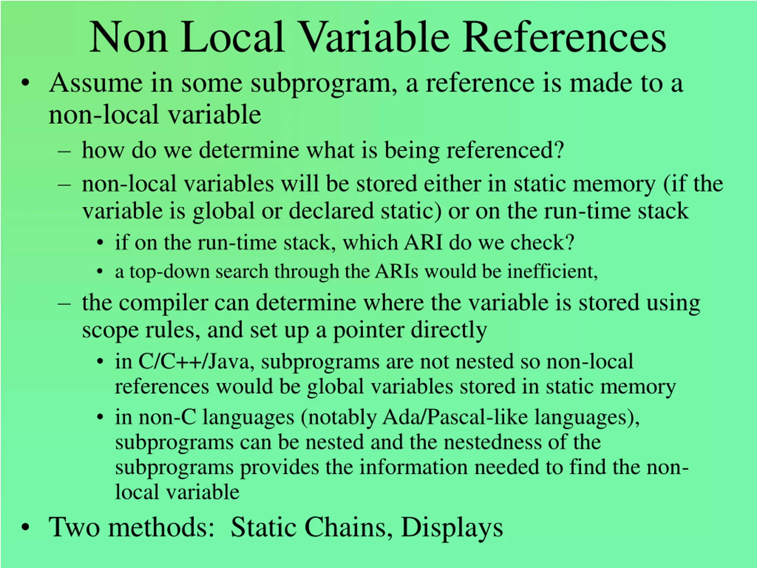 Non Local Variable References Assume in some subprogram, a reference is made to a non-local variable how do we determine what is being referenced? non-local variables will be stored either in static memory (if the variable is global or declared static) or on the run-time stack if on the run-time stack, which ARI do we check? a top-down search through the ARIs would be inefficient, the compiler can determine where the variable is stored using scope rules, and set up a pointer directly in C/C++/Java, subprograms are not nested so non-local references would be global variables stored in static memory in non-C languages (notably Ada/Pascal-like languages), subprograms can be nested and the nestedness of the subprograms provides the information needed to find the non- local variable Two methods: Static Chains, Displays
