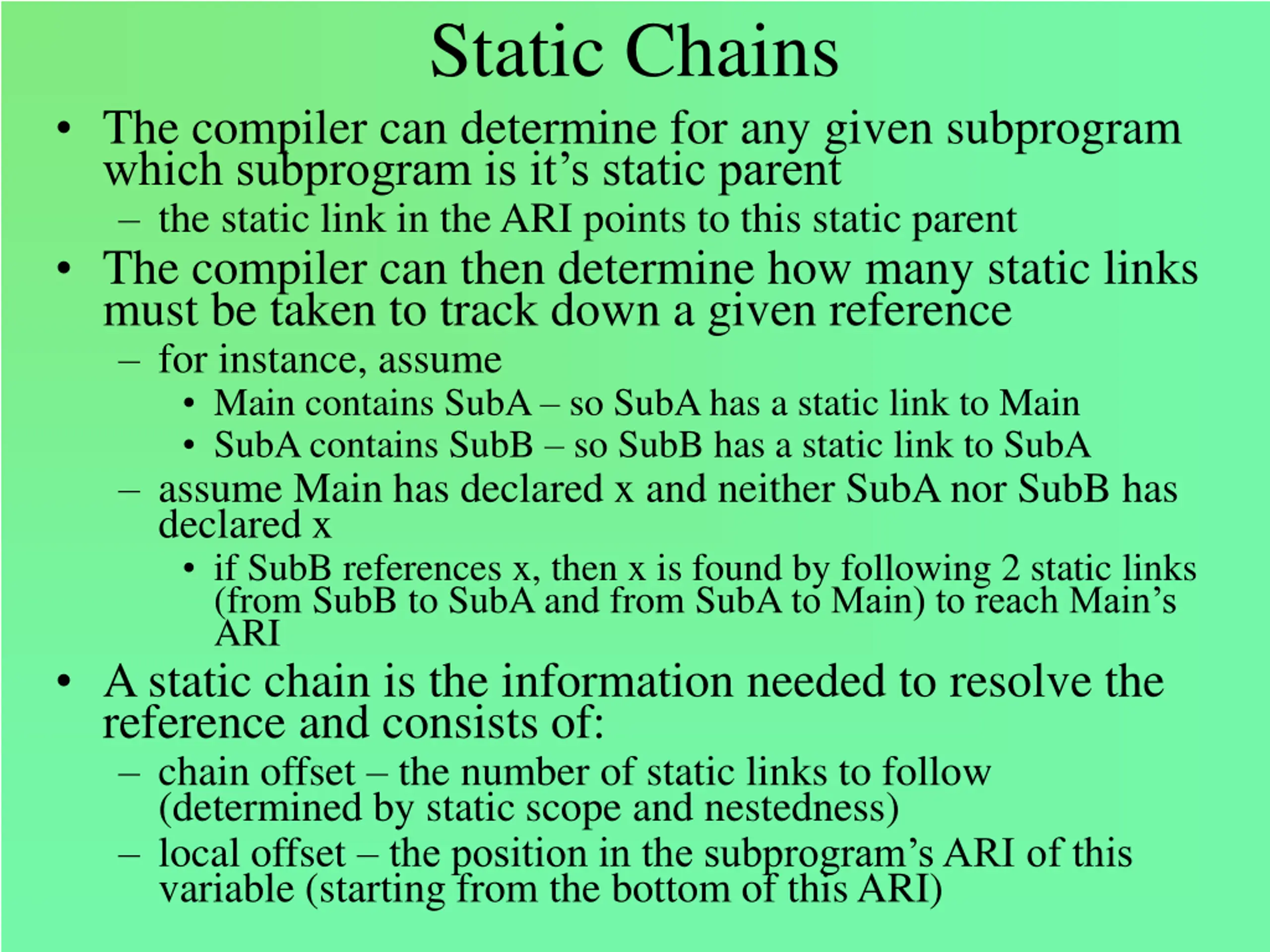 Static Chains The compiler can determine for any given subprogram which subprogram is it s static parent the static link in the ARI points to this static parent The compiler can then determine how many static links must be taken to track down a given reference for instance, assume Main contains SubA so SubA has a static link to Main SubA contains SubB so SubB has a static link to SubA assume Main has declared x and neither SubA nor SubB has declared x if SubB references x, then x is found by following 2 static links (from SubB to SubA and from SubA to Main) to reach Main s ARI A static chain is the information needed to resolve the reference and consists of: chain offset the number of static links to follow (determined by static scope and nestedness) local offset the position in the subprogram s ARI of this variable (starting from the bottom of this ARI)
