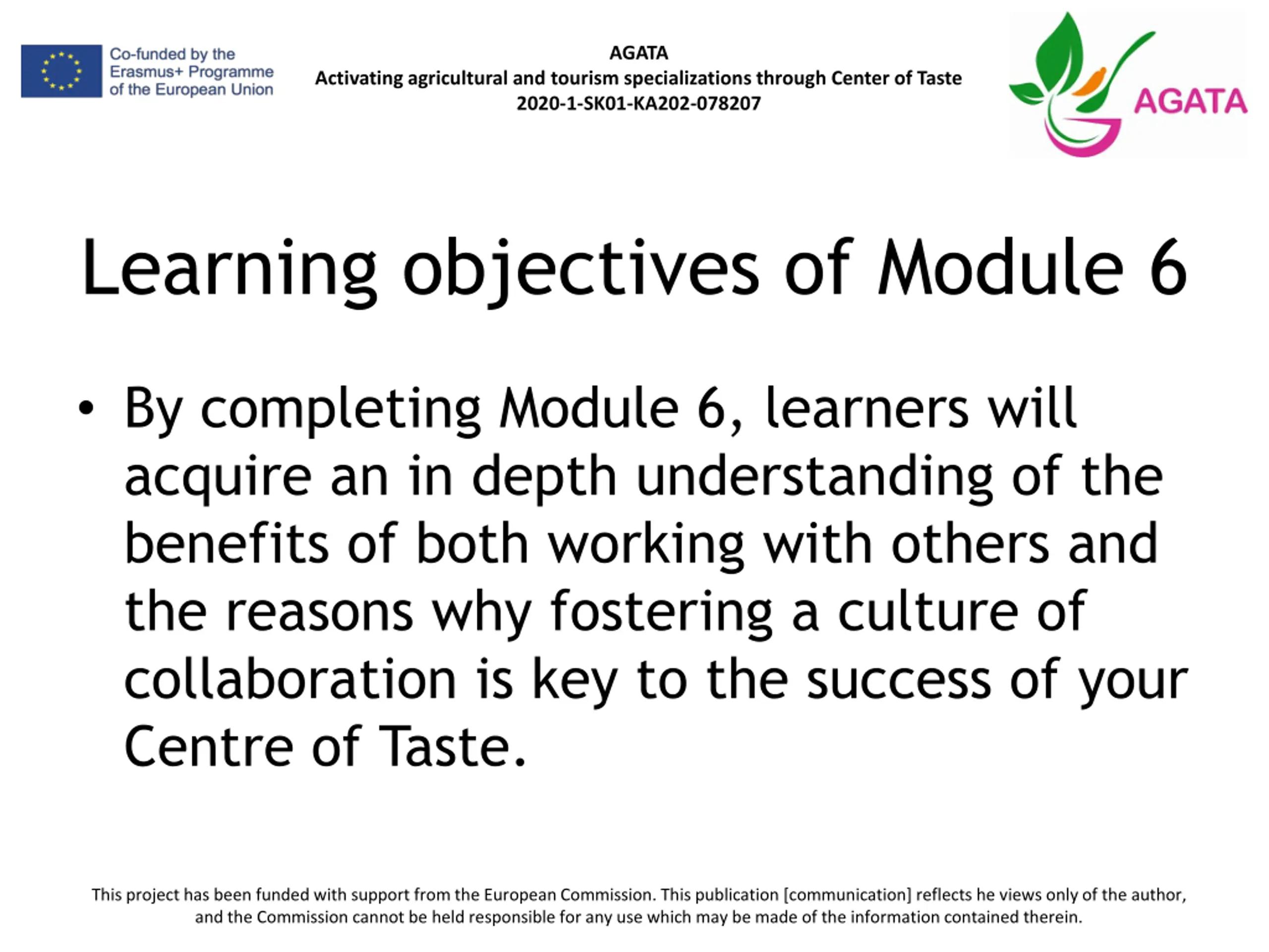 AGATA Activating agricultural and tourism specializations through Center of Taste 2020-1-SK01-KA202-078207 Learning objectives of Module 6 By completing Module 6, learners will acquire an in depth understanding of the benefits of both working with others and the reasons why fostering a culture of collaboration is key to the success of your Centre of Taste. This project has been funded with support from the European Commission. This publication [communication] reflects he views only of the author, and the Commission cannot be held responsible for any use which may be made of the information contained therein.