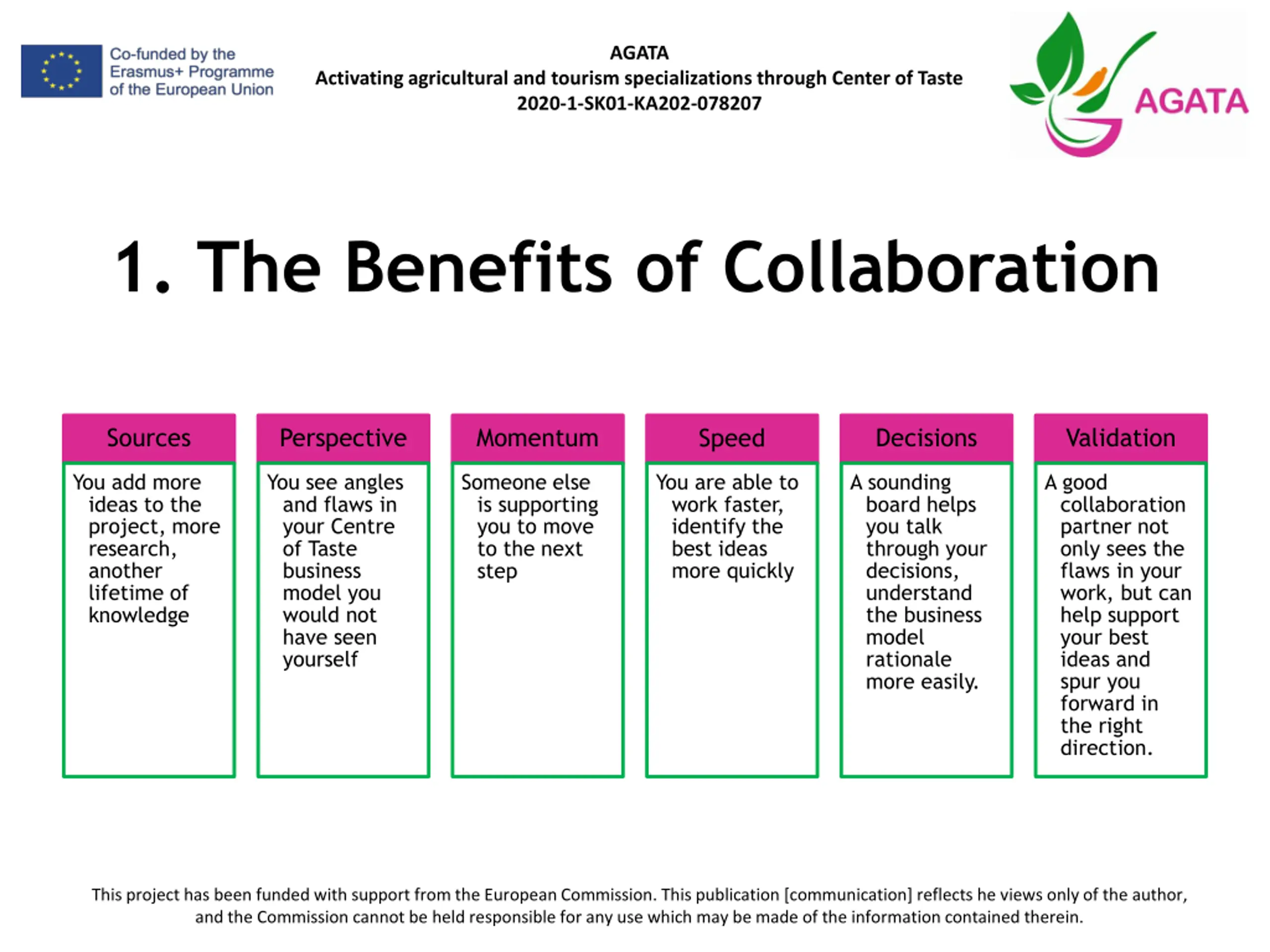 AGATA Activating agricultural and tourism specializations through Center of Taste 2020-1-SK01-KA202-078207 1. Why collaborate? You have a vision to develop a Centre of Taste idea, but you may not have the skillset or resources to make it happen alone. Through collaboration, you can build a coalition of complimentary support, skills, encouragement and resources. This project has been funded with support from the European Commission. This publication [communication] reflects he views only of the author, and the Commission cannot be held responsible for any use which may be made of the information contained therein.