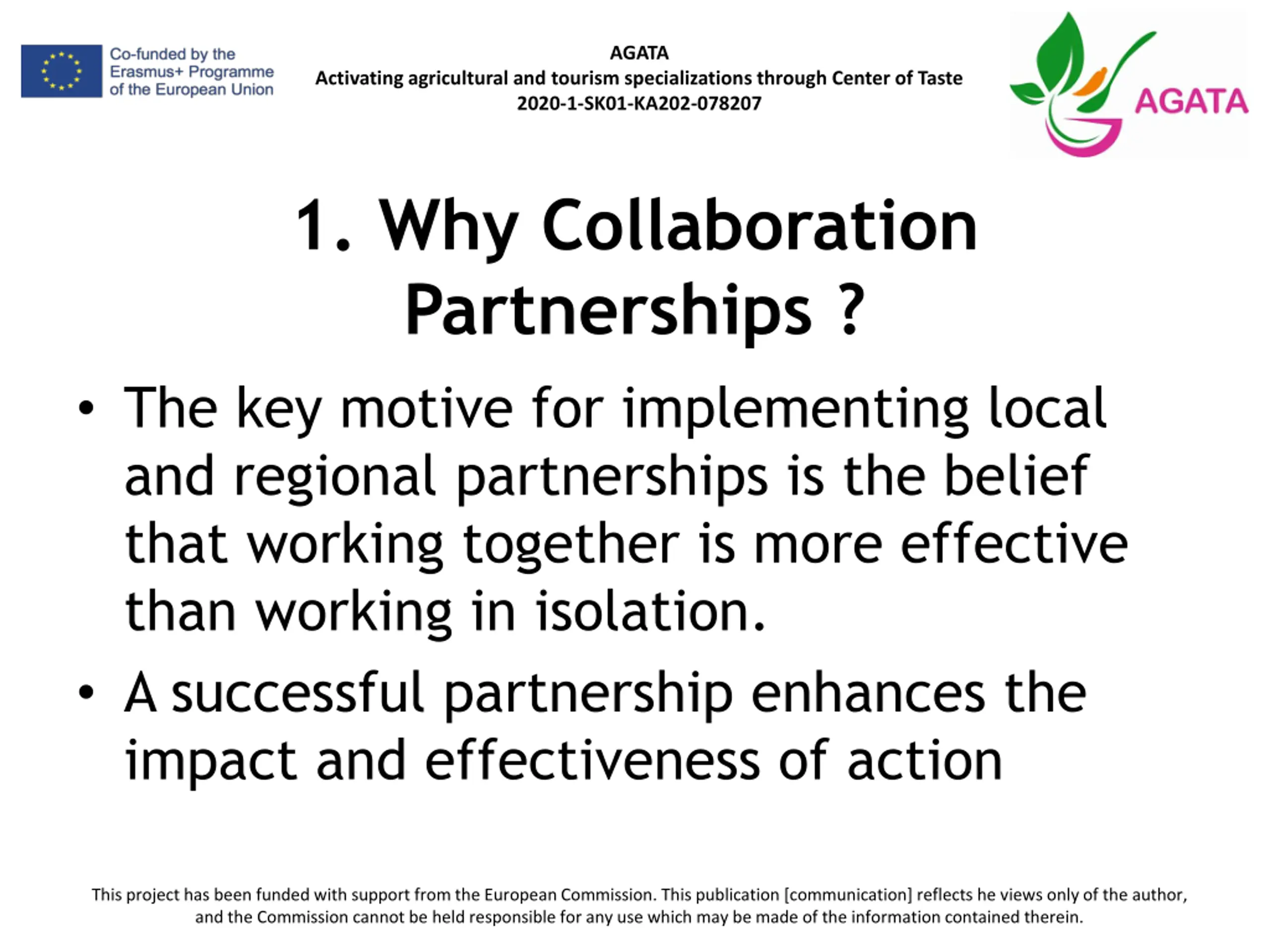 AGATA Activating agricultural and tourism specializations through Center of Taste 2020-1-SK01-KA202-078207 1. Why Collaboration Partnerships ? The key motive for implementing local and regional partnerships is the belief that working together is more effective than working in isolation. A successful partnership enhances the impact and effectiveness of action This project has been funded with support from the European Commission. This publication [communication] reflects he views only of the author, and the Commission cannot be held responsible for any use which may be made of the information contained therein.