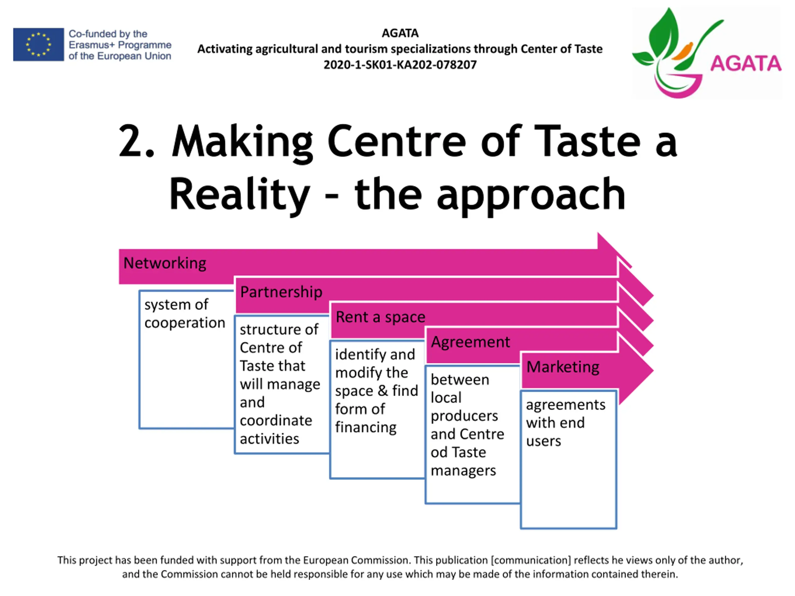 AGATA Activating agricultural and tourism specializations through Center of Taste 2020-1-SK01-KA202-078207 2. Making Centre of Taste a Reality the approach Networking Partnership system of cooperation Rent a space structure of Centre of Taste that will manage and coordinate activities Agreement identify and modify the space & find form of financing Marketing between local producers and Centre od Taste managers agreements with end users This project has been funded with support from the European Commission. This publication [communication] reflects he views only of the author, and the Commission cannot be held responsible for any use which may be made of the information contained therein.
