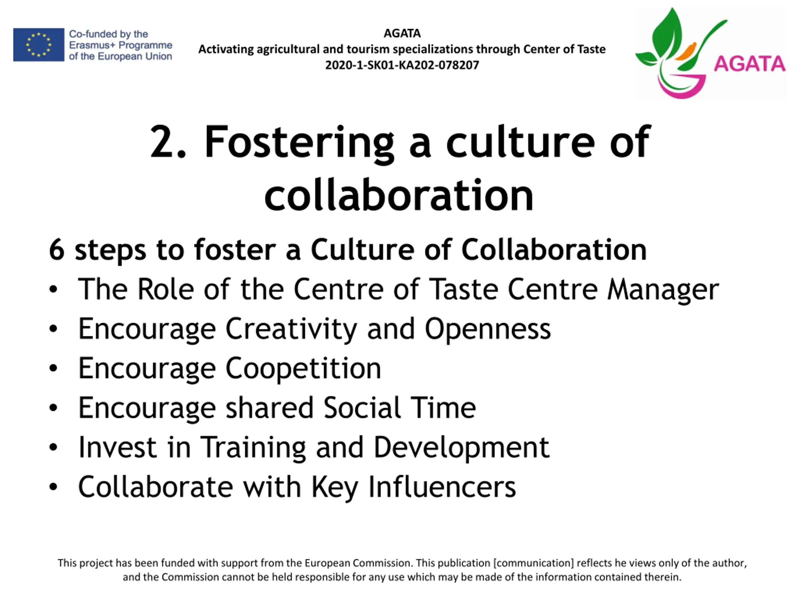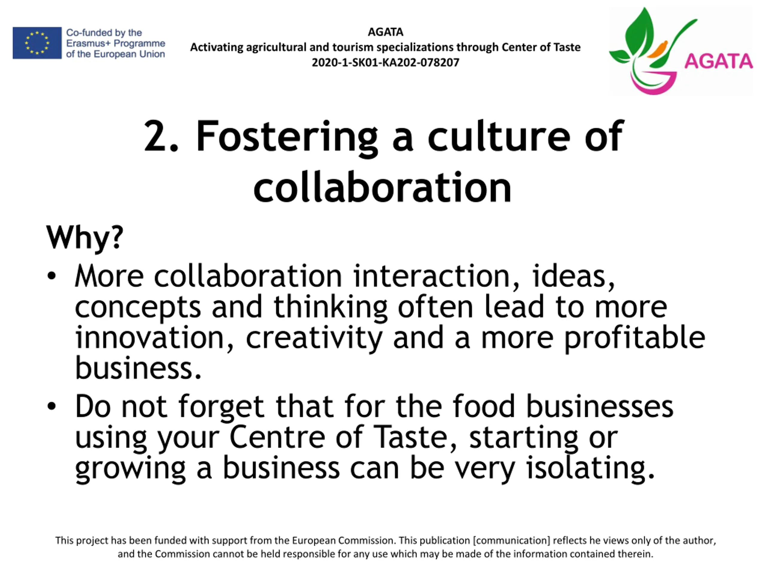 AGATA Activating agricultural and tourism specializations through Center of Taste 2020-1-SK01-KA202-078207 2. Fostering a culture of collaboration Why? More collaboration interaction, ideas, concepts and thinking often lead to more innovation, creativity and a more profitable business. Do not forget that for the food businesses using your Centre of Taste, starting or growing a business can be very isolating. This project has been funded with support from the European Commission. This publication [communication] reflects he views only of the author, and the Commission cannot be held responsible for any use which may be made of the information contained therein.