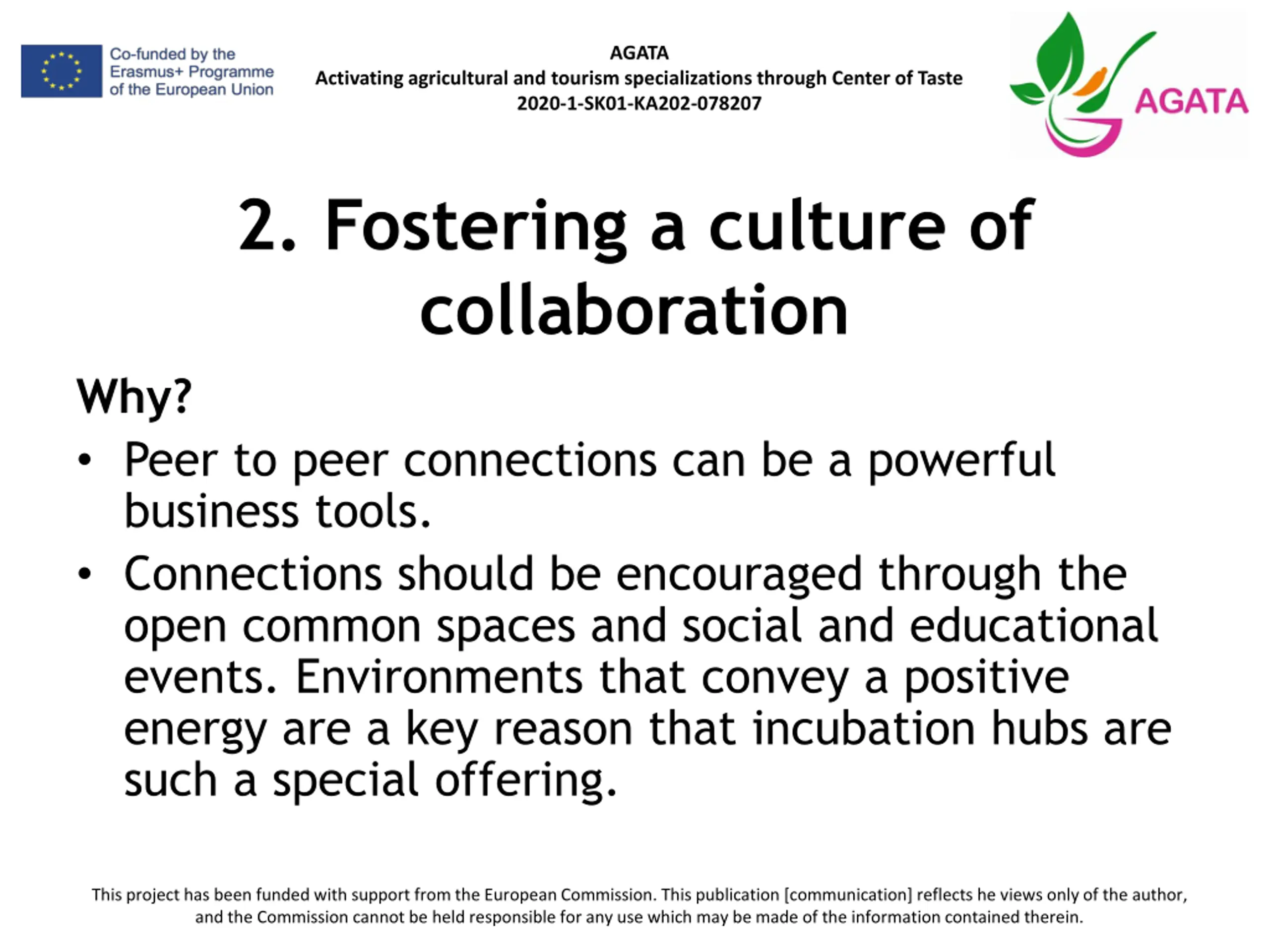 AGATA Activating agricultural and tourism specializations through Center of Taste 2020-1-SK01-KA202-078207 2. Fostering a culture of collaboration Why? Peer to peer connections can be a powerful business tools. Connections should be encouraged through the open common spaces and social and educational events. Environments that convey a positive energy are a key reason that incubation hubs are such a special offering. This project has been funded with support from the European Commission. This publication [communication] reflects he views only of the author, and the Commission cannot be held responsible for any use which may be made of the information contained therein.