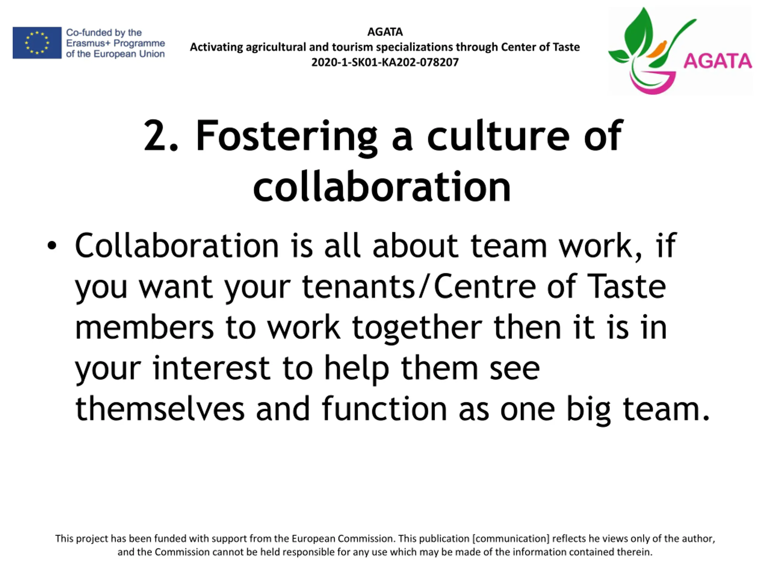 AGATA Activating agricultural and tourism specializations through Center of Taste 2020-1-SK01-KA202-078207 2. Fostering a culture of collaboration Collaboration is all about team work, if you want your tenants/Centre of Taste members to work together then it is in your interest to help them see themselves and function as one big team. This project has been funded with support from the European Commission. This publication [communication] reflects he views only of the author, and the Commission cannot be held responsible for any use which may be made of the information contained therein.