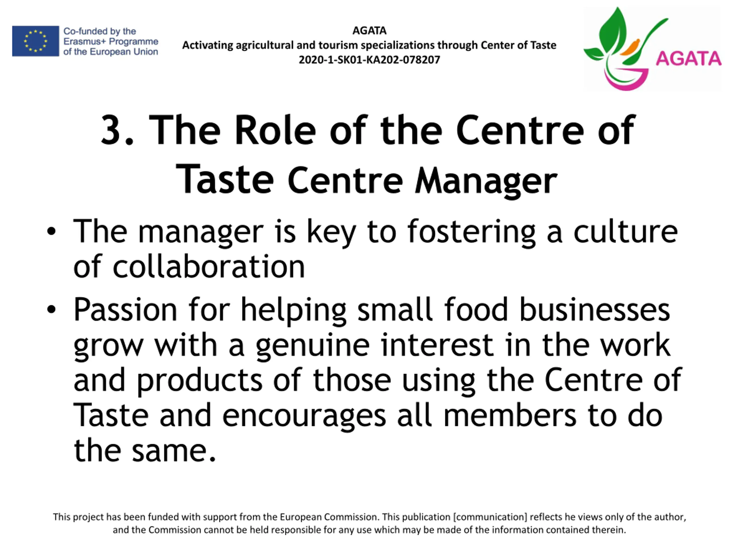 AGATA Activating agricultural and tourism specializations through Center of Taste 2020-1-SK01-KA202-078207 3. The Role of the Centre of Taste Centre Manager The manager is key to fostering a culture of collaboration Passion for helping small food businesses grow with a genuine interest in the work and products of those using the Centre of Taste and encourages all members to do the same. This project has been funded with support from the European Commission. This publication [communication] reflects he views only of the author, and the Commission cannot be held responsible for any use which may be made of the information contained therein.