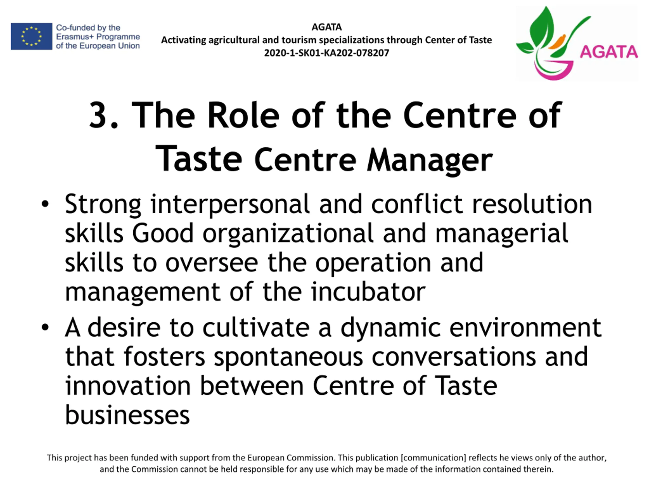 AGATA Activating agricultural and tourism specializations through Center of Taste 2020-1-SK01-KA202-078207 3. The Role of the Centre of Taste Centre Manager Strong interpersonal and conflict resolution skills Good organizational and managerial skills to oversee the operation and management of the incubator A desire to cultivate a dynamic environment that fosters spontaneous conversations and innovation between Centre of Taste businesses This project has been funded with support from the European Commission. This publication [communication] reflects he views only of the author, and the Commission cannot be held responsible for any use which may be made of the information contained therein.