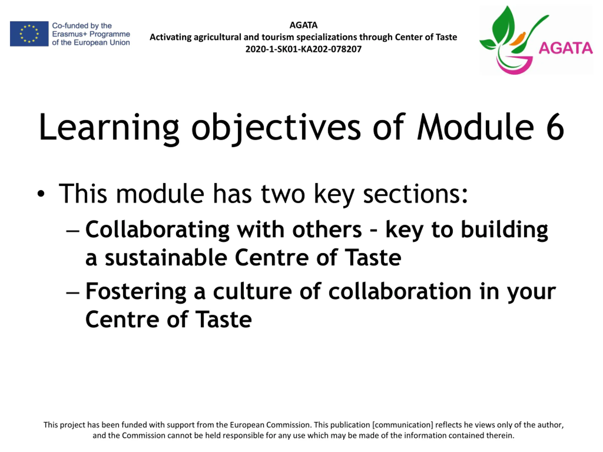 AGATA Activating agricultural and tourism specializations through Center of Taste 2020-1-SK01-KA202-078207 Learning objectives of Module 6 This module has two key sections: Collaborating with others key to building a sustainable Centre of Taste Fostering a culture of collaboration in your Centre of Taste This project has been funded with support from the European Commission. This publication [communication] reflects he views only of the author, and the Commission cannot be held responsible for any use which may be made of the information contained therein.