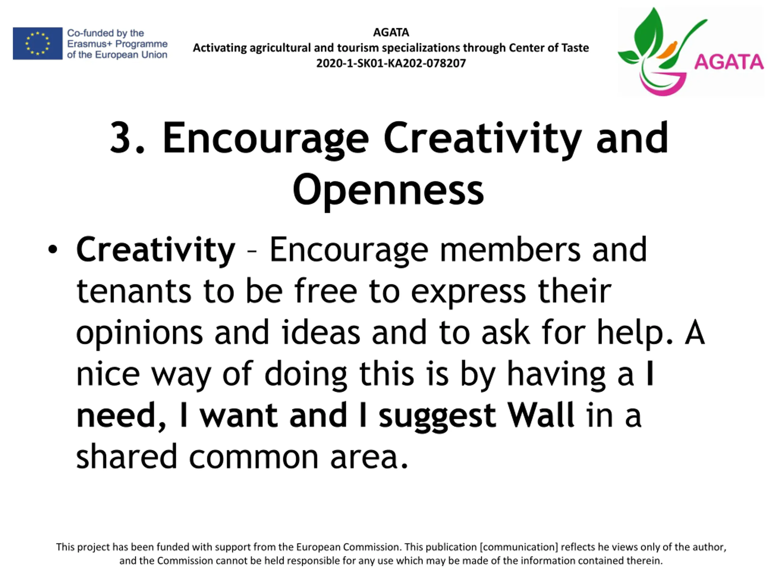 AGATA Activating agricultural and tourism specializations through Center of Taste 2020-1-SK01-KA202-078207 3. Encourage Creativity and Openness Creativity Encourage members and tenants to be free to express their opinions and ideas and to ask for help. A nice way of doing this is by having a I need, I want and I suggest Wall in a shared common area. This project has been funded with support from the European Commission. This publication [communication] reflects he views only of the author, and the Commission cannot be held responsible for any use which may be made of the information contained therein.