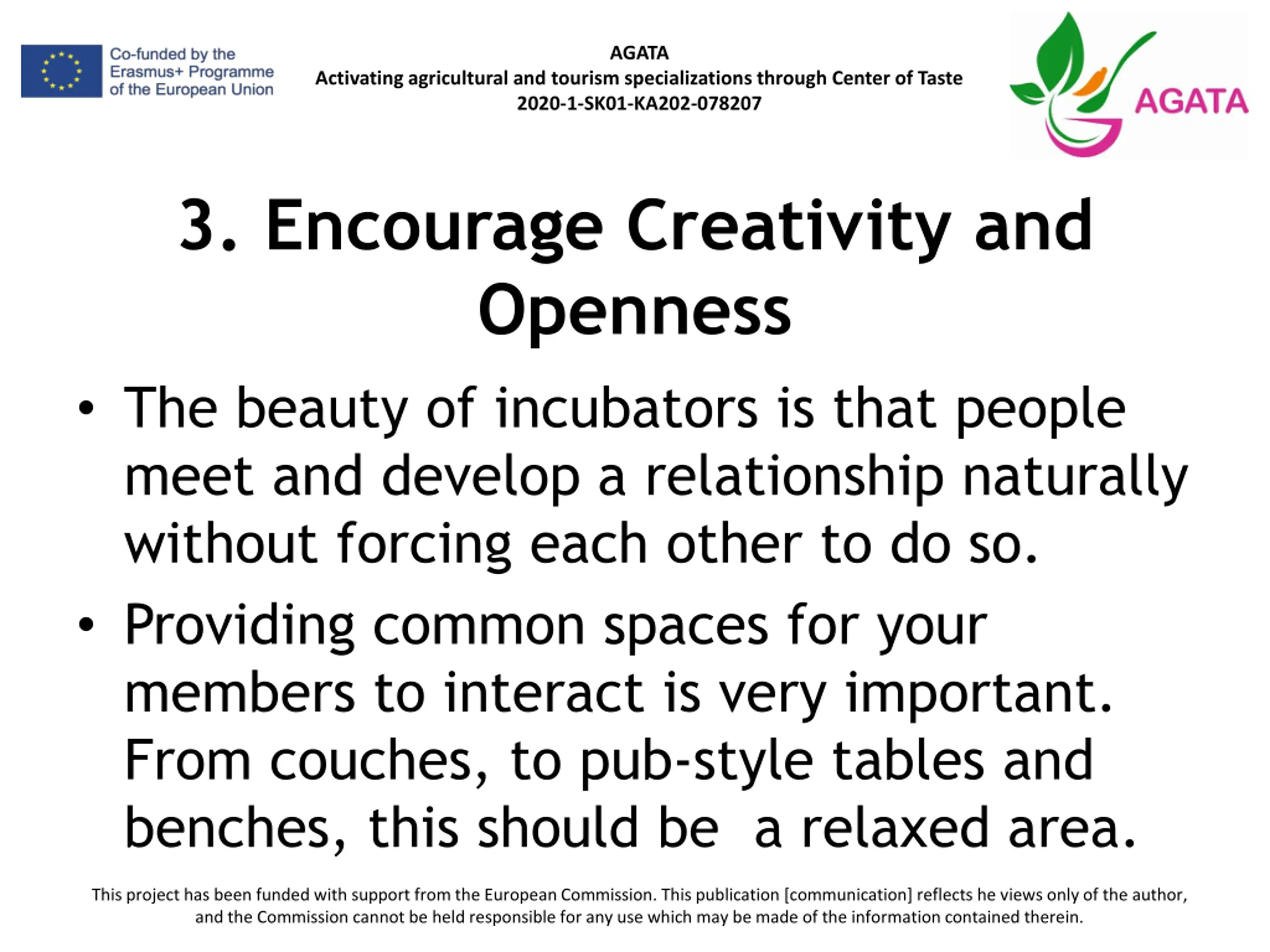 AGATA Activating agricultural and tourism specializations through Center of Taste 2020-1-SK01-KA202-078207 3. Encourage Creativity and Openness The beauty of incubators is that people meet and develop a relationship naturally without forcing each other to do so. Providing common spaces for your members to interact is very important. From couches, to pub-style tables and benches, this should be a relaxed area. This project has been funded with support from the European Commission. This publication [communication] reflects he views only of the author, and the Commission cannot be held responsible for any use which may be made of the information contained therein.