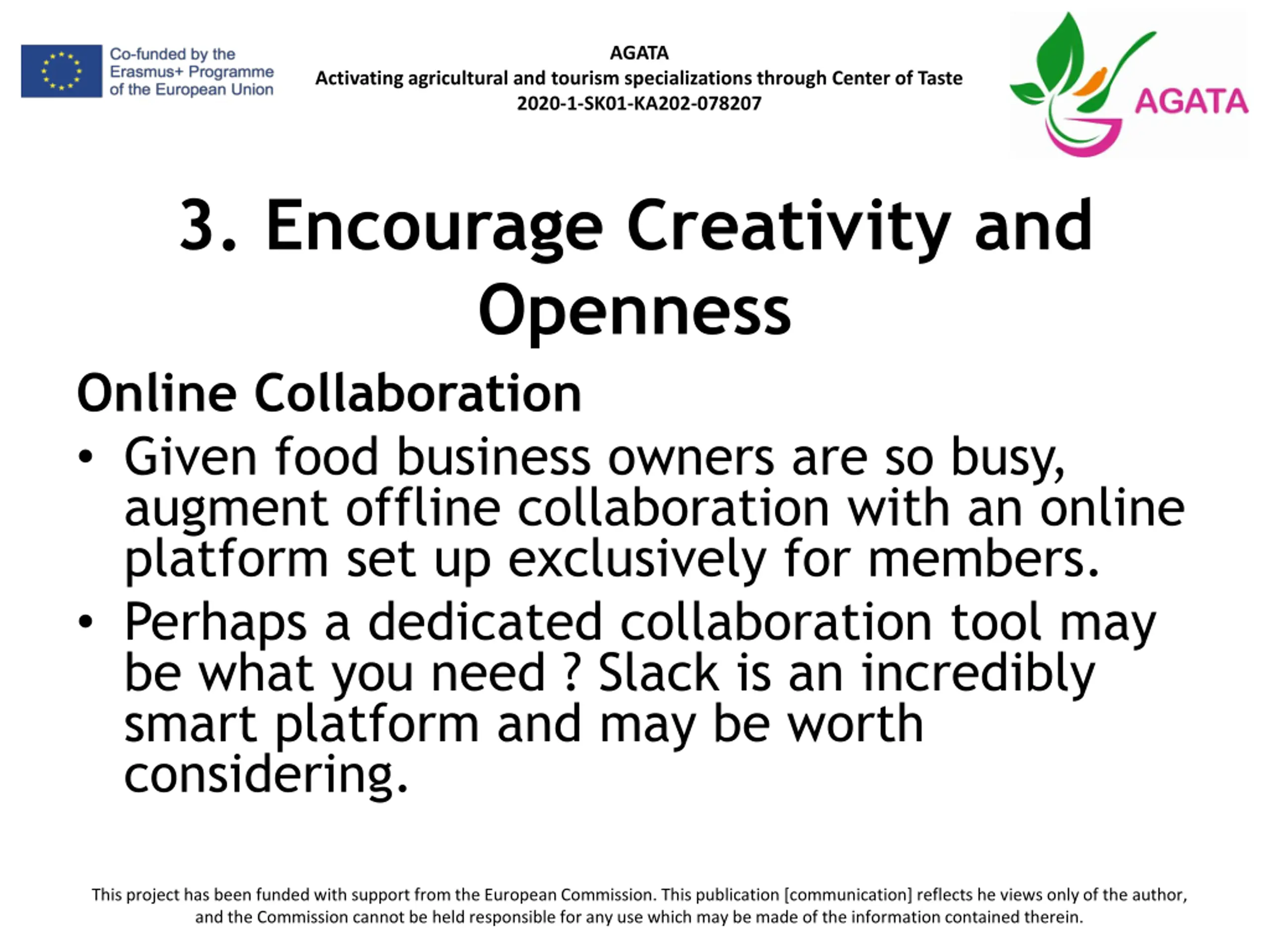 AGATA Activating agricultural and tourism specializations through Center of Taste 2020-1-SK01-KA202-078207 3. Encourage Creativity and Openness Online Collaboration Given food business owners are so busy, augment offline collaboration with an online platform set up exclusively for members. Perhaps a dedicated collaboration tool may be what you need ? Slack is an incredibly smart platform and may be worth considering. This project has been funded with support from the European Commission. This publication [communication] reflects he views only of the author, and the Commission cannot be held responsible for any use which may be made of the information contained therein.