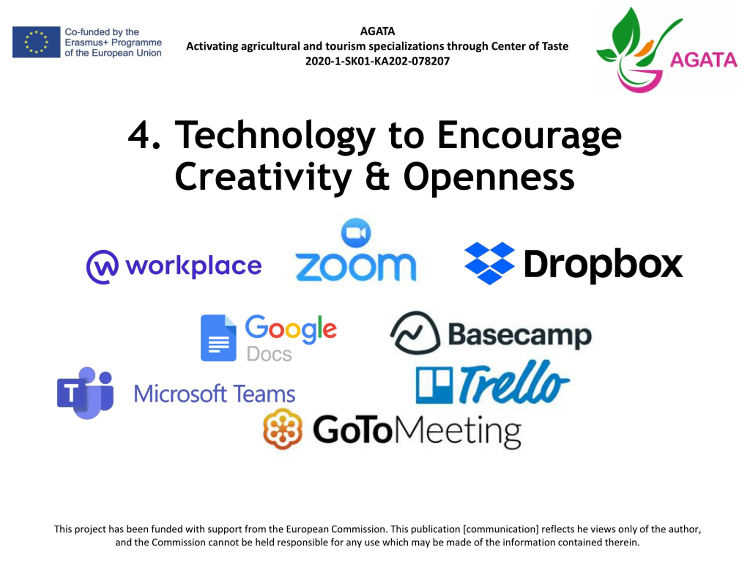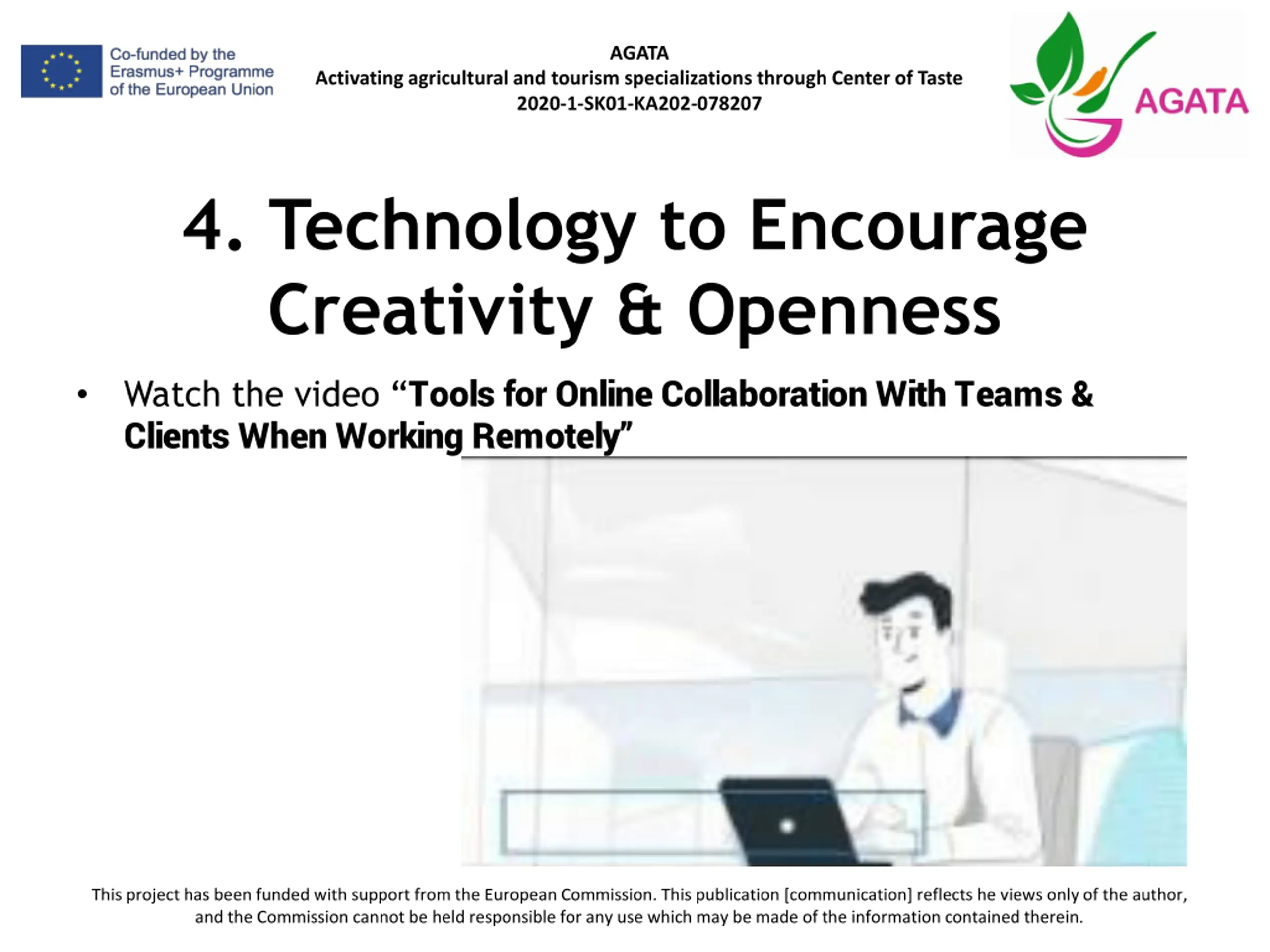 AGATA Activating agricultural and tourism specializations through Center of Taste 2020-1-SK01-KA202-078207 4. Technology to Encourage Creativity & Openness Watch the video Tools for Online Collaboration With Teams & Clients When Working Remotely This project has been funded with support from the European Commission. This publication [communication] reflects he views only of the author, and the Commission cannot be held responsible for any use which may be made of the information contained therein.