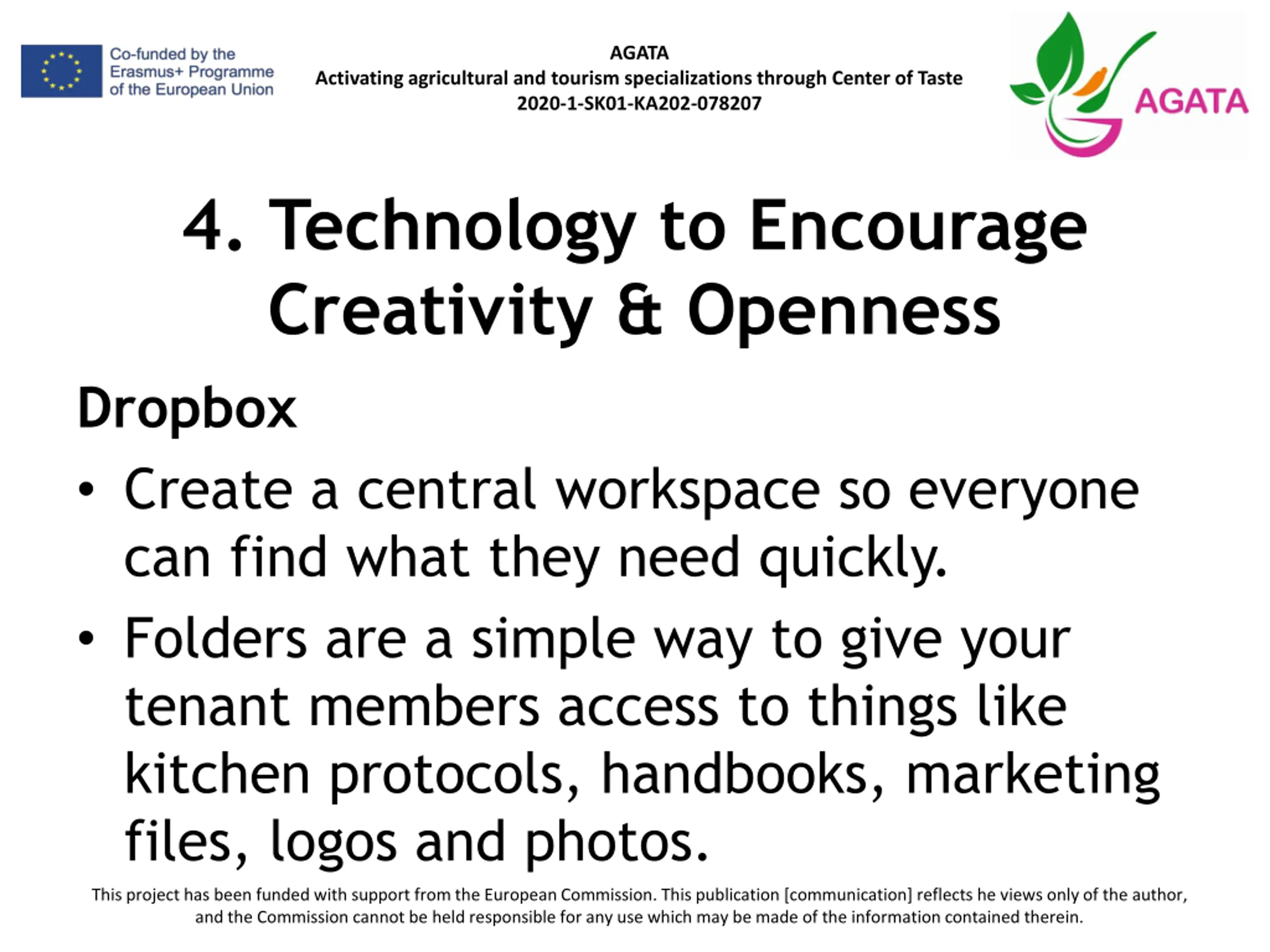 AGATA Activating agricultural and tourism specializations through Center of Taste 2020-1-SK01-KA202-078207 4. Technology to Encourage Creativity & Openness Dropbox Create a central workspace so everyone can find what they need quickly. Folders are a simple way to give your tenant members access to things like kitchen protocols, handbooks, marketing files, logos and photos. This project has been funded with support from the European Commission. This publication [communication] reflects he views only of the author, and the Commission cannot be held responsible for any use which may be made of the information contained therein.