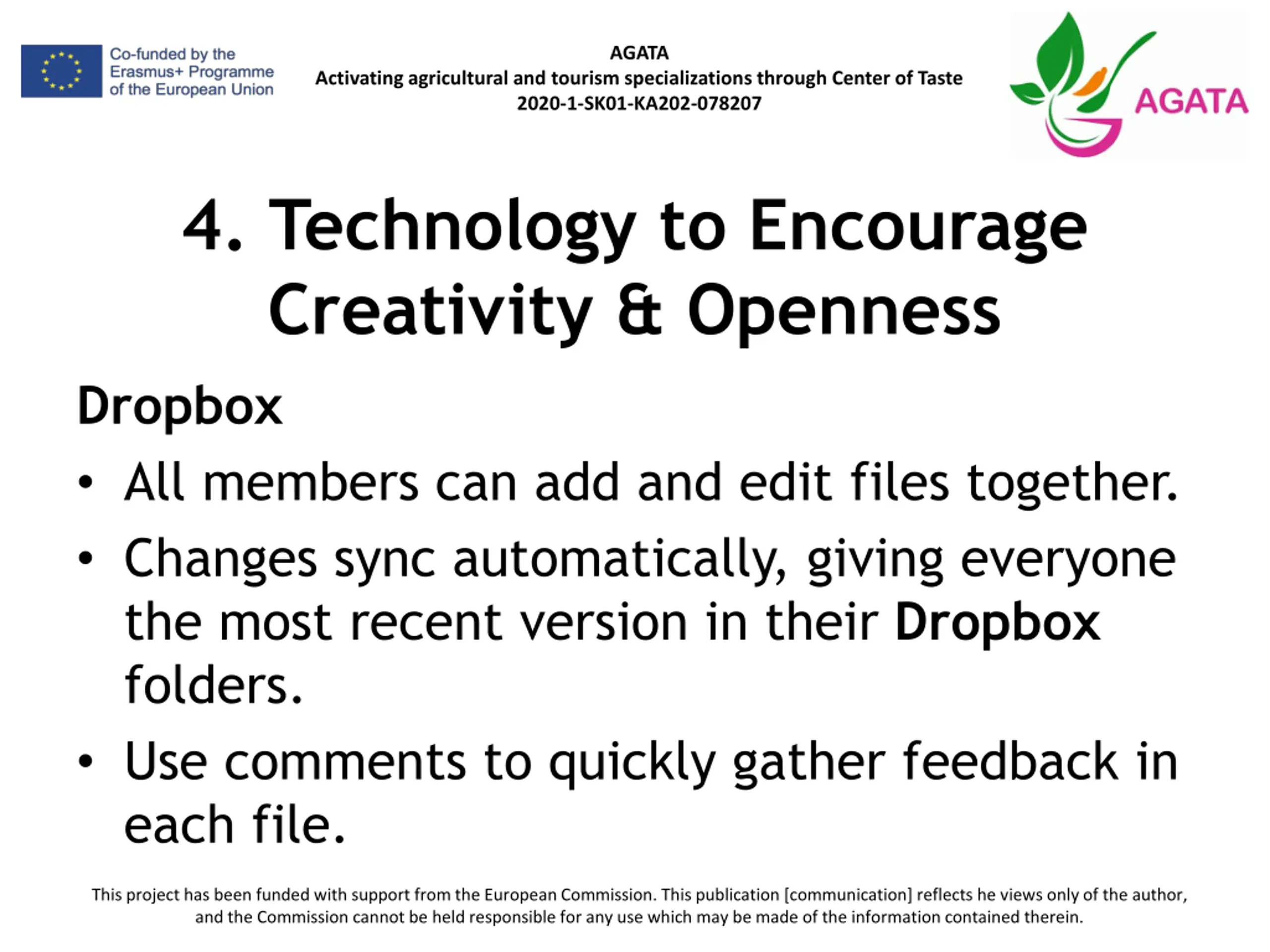 AGATA Activating agricultural and tourism specializations through Center of Taste 2020-1-SK01-KA202-078207 4. Technology to Encourage Creativity & Openness Dropbox All members can add and edit files together. Changes sync automatically, giving everyone the most recent version in their Dropbox folders. Use comments to quickly gather feedback in each file. This project has been funded with support from the European Commission. This publication [communication] reflects he views only of the author, and the Commission cannot be held responsible for any use which may be made of the information contained therein.
