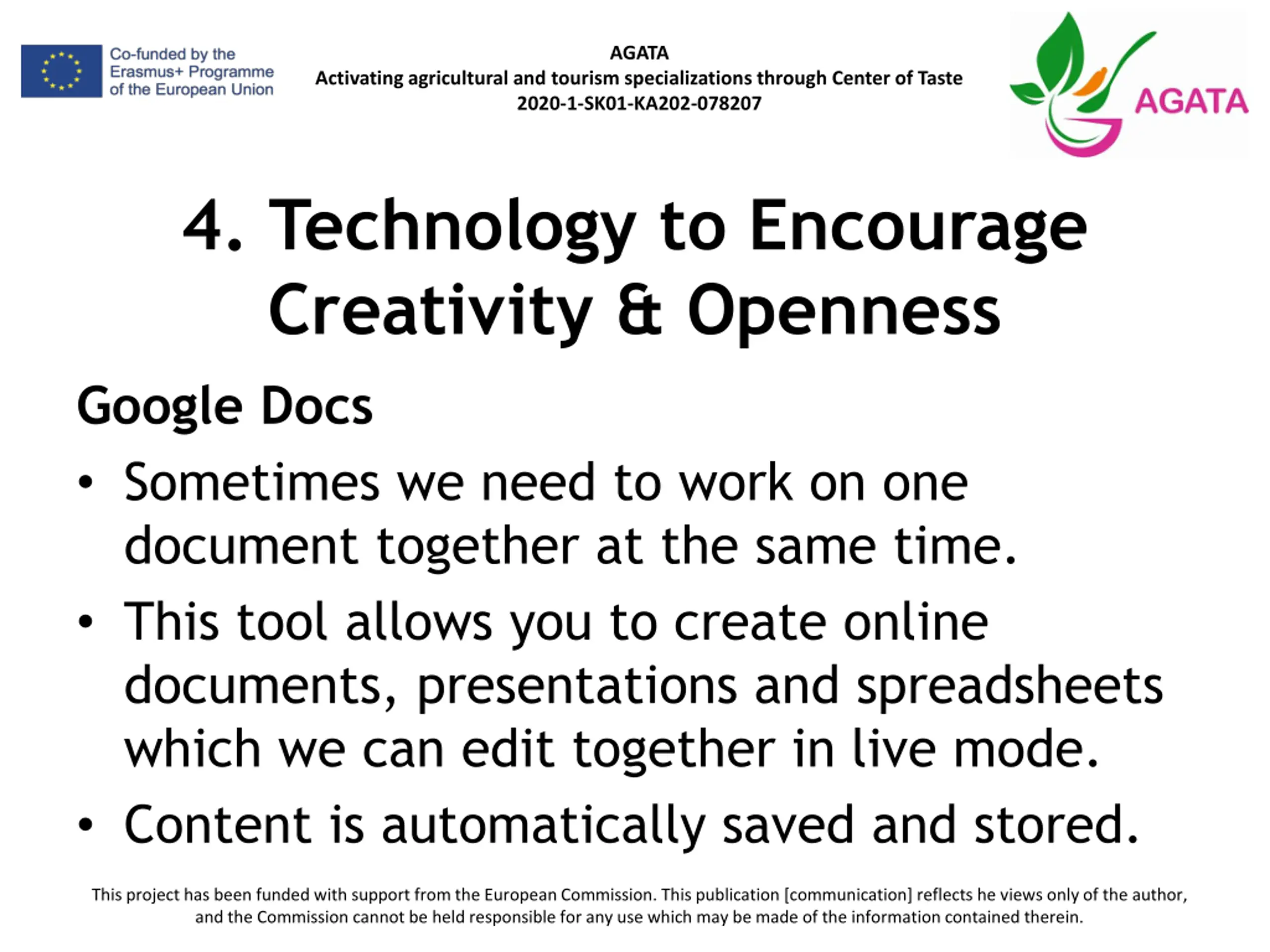 AGATA Activating agricultural and tourism specializations through Center of Taste 2020-1-SK01-KA202-078207 4. Technology to Encourage Creativity & Openness Google Docs Sometimes we need to work on one document together at the same time. This tool allows you to create online documents, presentations and spreadsheets which we can edit together in live mode. Content is automatically saved and stored. This project has been funded with support from the European Commission. This publication [communication] reflects he views only of the author, and the Commission cannot be held responsible for any use which may be made of the information contained therein.